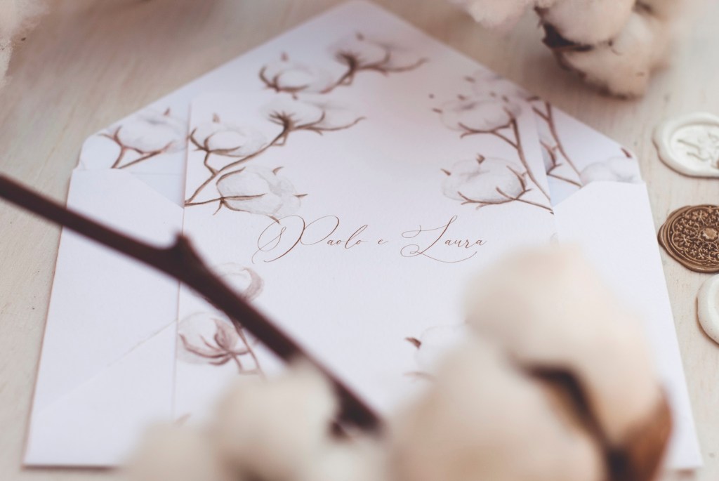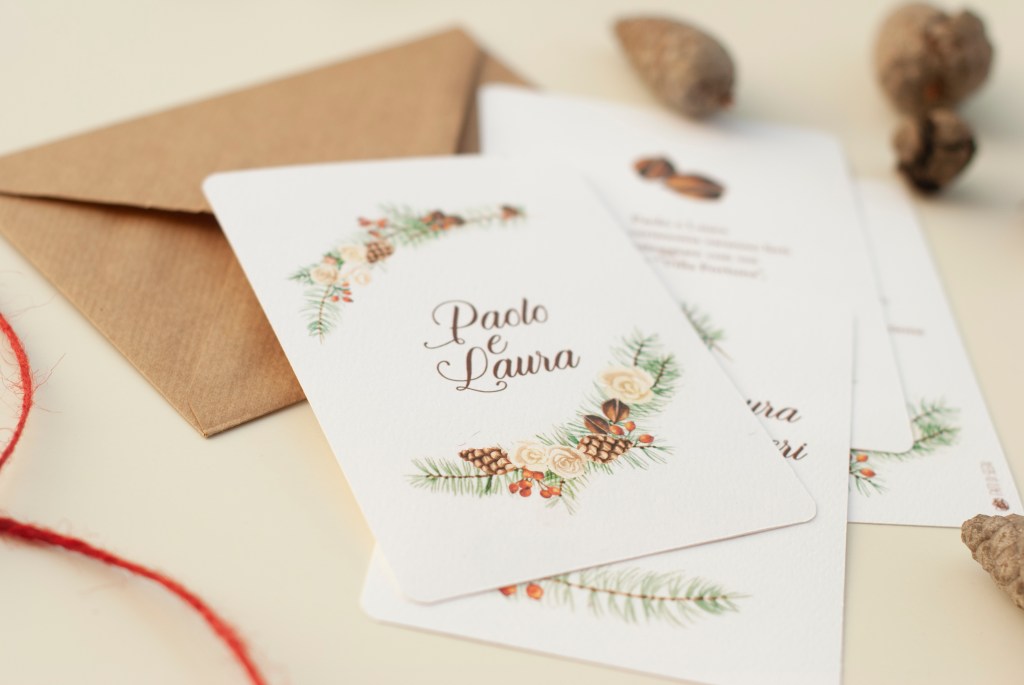 Negli ultimi anni però stiamo assistendo alla comparizione di una nuova tendenza: finalmente iniziano a diffondersi e a essere apprezzati anche i matrimoni autunnali e invernali! Effettivamente avevo trascurato le coppie che si sposano in autunno e inverno o nel periodo natalizio, quindi ho rimediato creando una piccola sezione di temi botanici invernali dipingendo pigne, rami d’abete, noci e bacche, fiori di cotone oppure con cristalli di ghiaccio. Inoltre sono adatti alle stagioni fredde anche alcuni temi “neutri” come il toile de joy e i soffioni di tarassaco. E a te piacciono i matrimoni invernali?