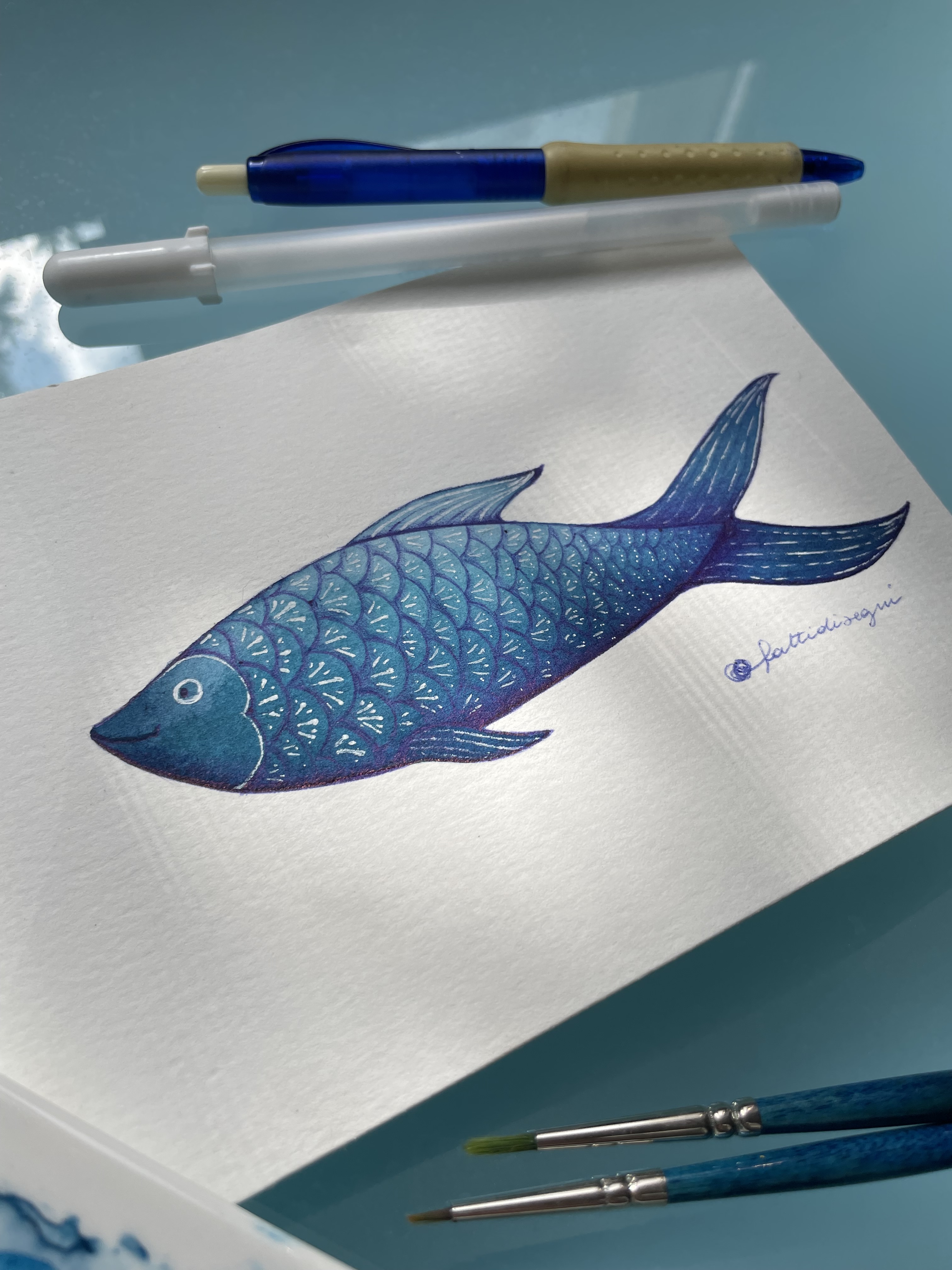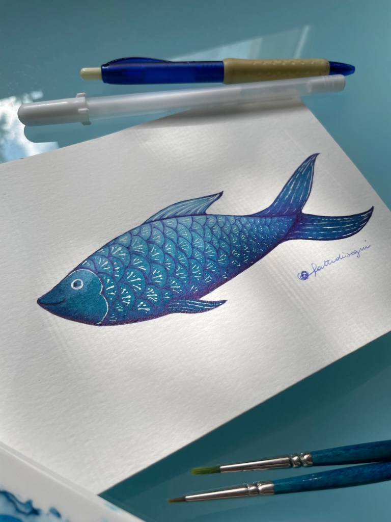 A me capita di dipingere pesci e poi decorarli con la penna a sfera e con quella gel bianca… non sono per niente minimale nella mia tecnica: (purtroppo) mi piace perdermi nei dettagli infinitesimali, stratificare colore e inchiostri anche se questo significa che per fare una tavola mi ci vuole moooooooooltissimo tempo!