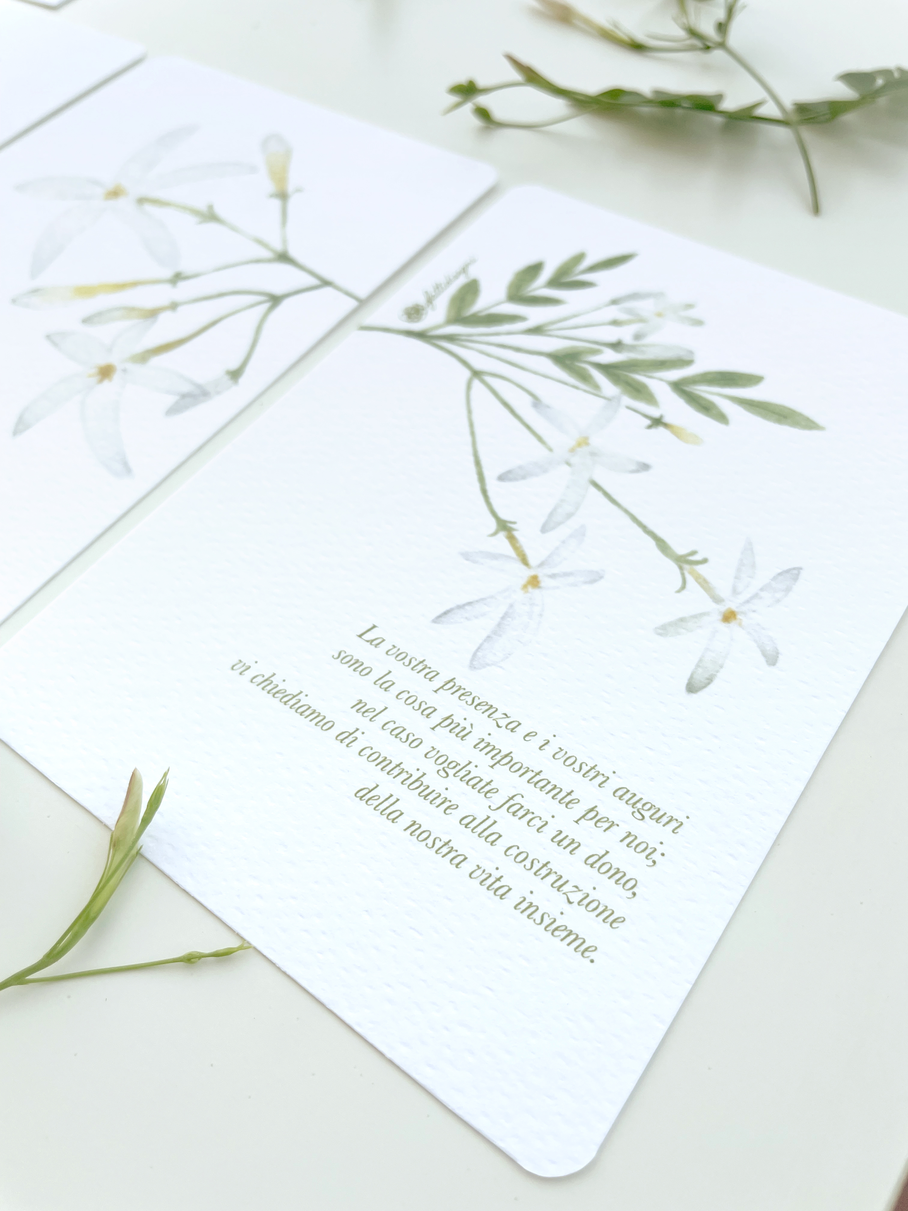Sconsiglio di mettere nella busta direttamente il biglietto del negozio lista nozze perché essendo di un formato diverso o realizzato con colori non in palette con la partecipazione, sarebbe la prima cosa che salterebbe all’occhio degli invitati, prima ancora di sapere chi si sposa!