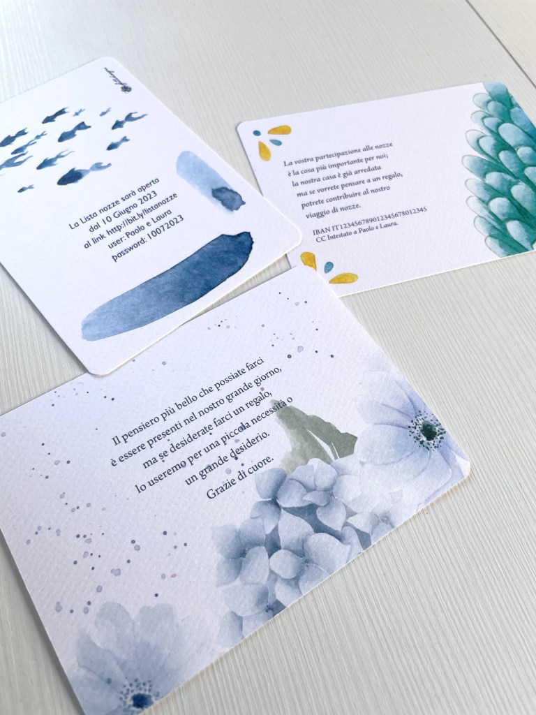 Io propongo di aggiungere una card in cui si scrivono le “direttive” introdotti da una frase che educatamente metta in chiaro che il regalo non è necessario, ma nel caso gli invitati volessero farlo, possono usufruire della lista nozze al negozio fisico, la lista nozze online, la lista viaggio in agenzia o fare un bonifico per contribuire a un mutuo, al viaggio o alle spese della coppia.