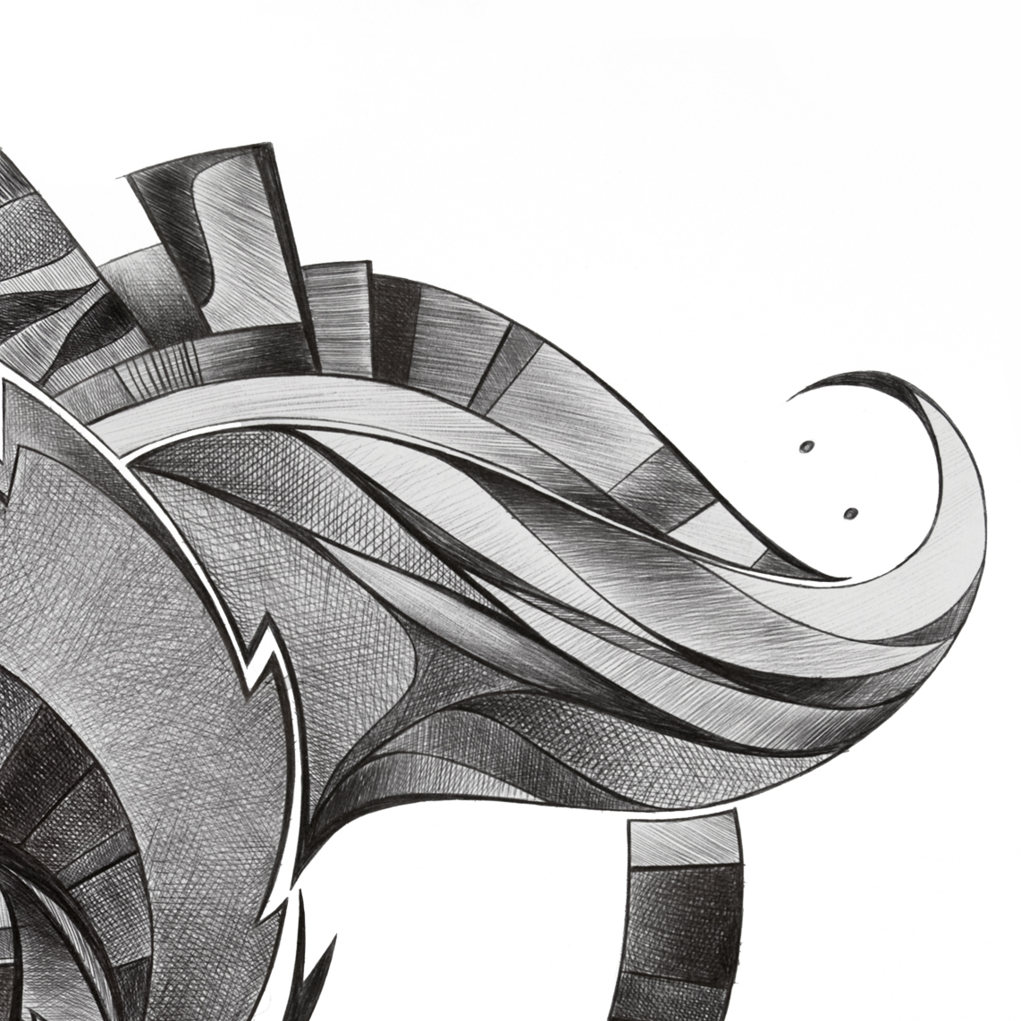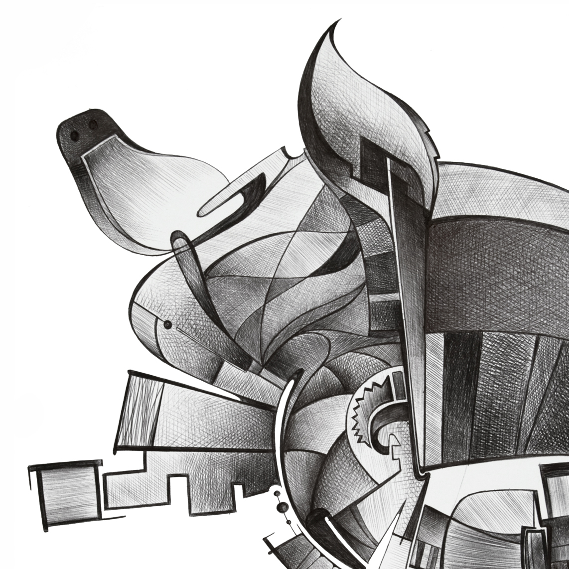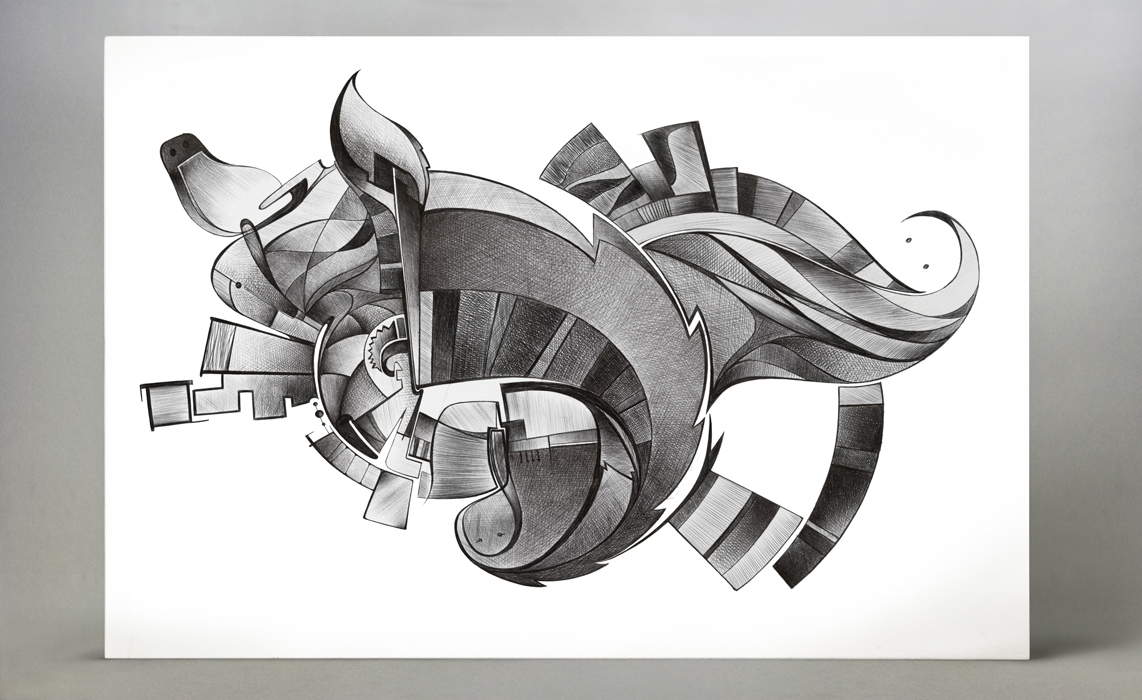 Tutto si frammenta in linee e volute dentro un vortice dove l’inizio si perde nella fine e una forma rincorre l’altra.