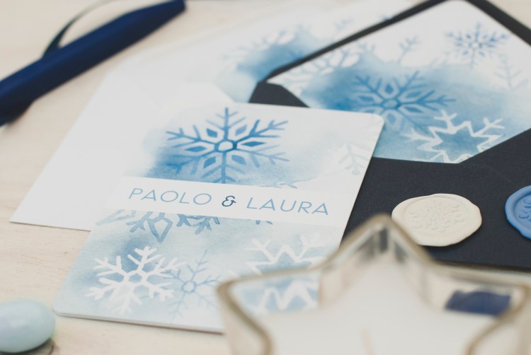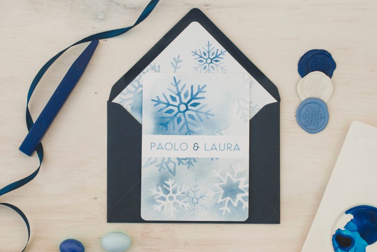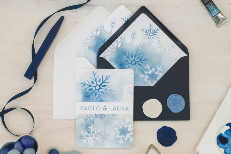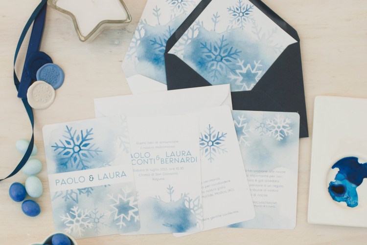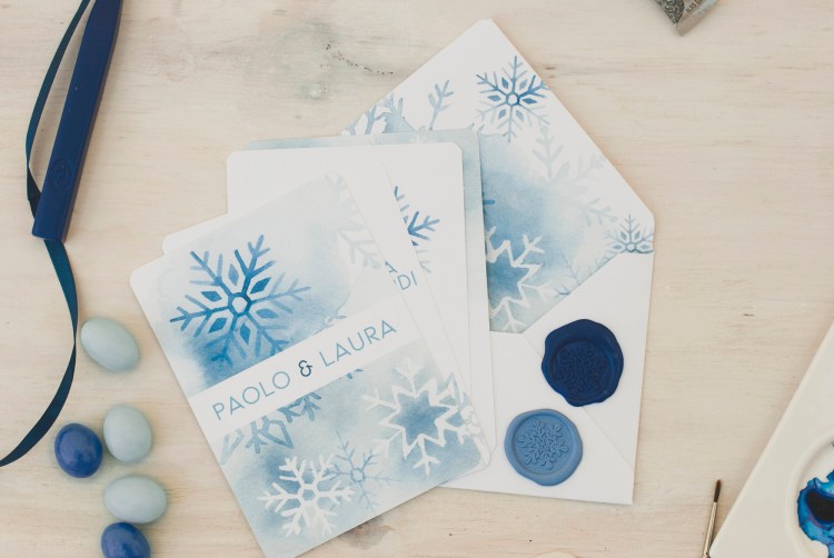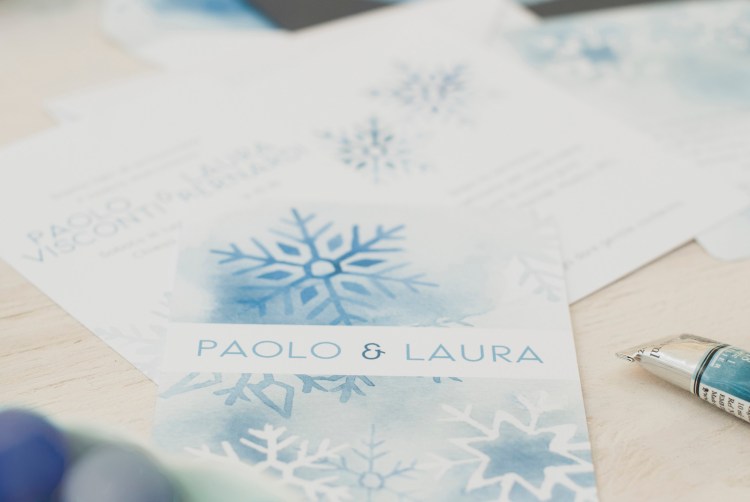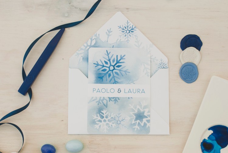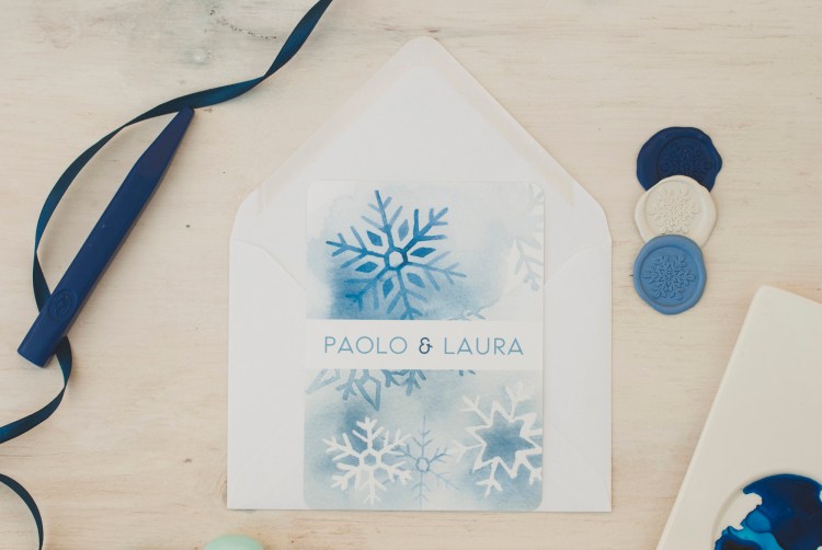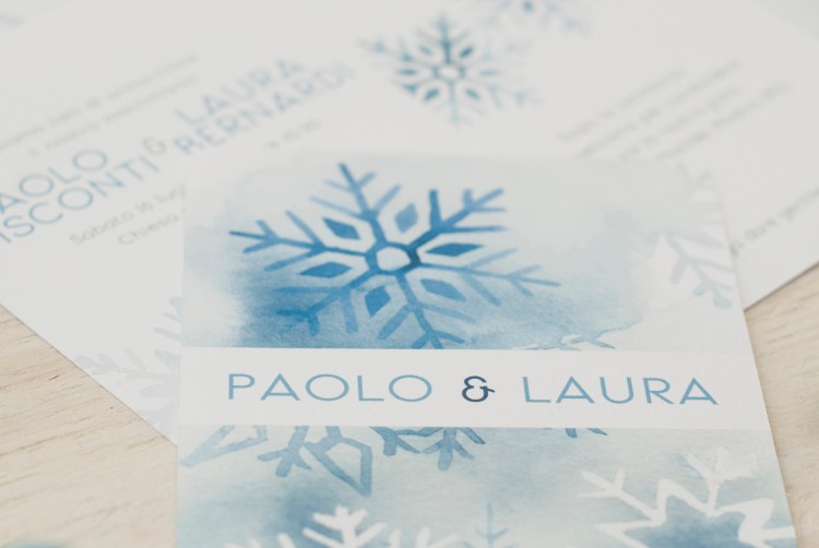 Partecipazioni a tema floreale con illustrazioni ad acquerello di cristalli di ghiaccio; è un coordinato per coppie che si sposano in inverno e che cercano uno stile elegante e delicato.