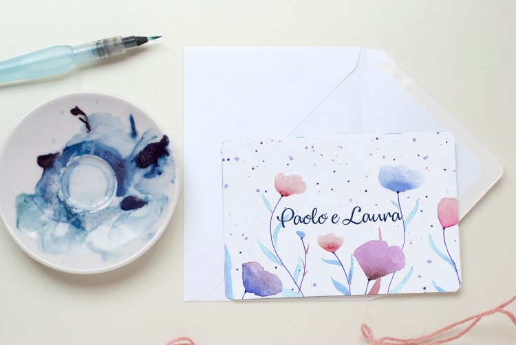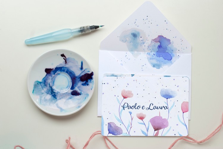 In alternativa alla busta standard puoi scegliere la busta artigianale con la stampa della texture illustrata ad acquerello.