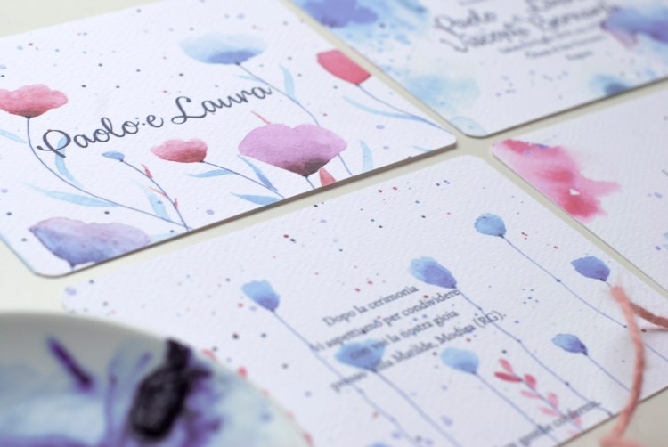 Partecipazione a tema floreale con stampe di illustrazione ad acquerello; è particolarmente adatta per un matrimonio romantico con colori decisi.