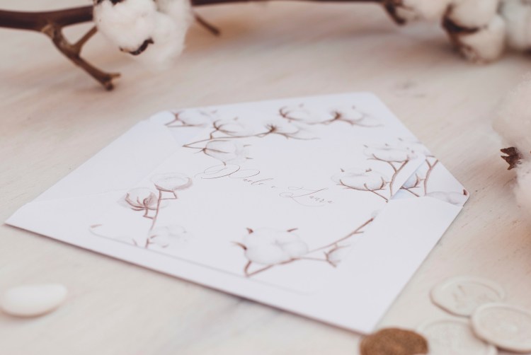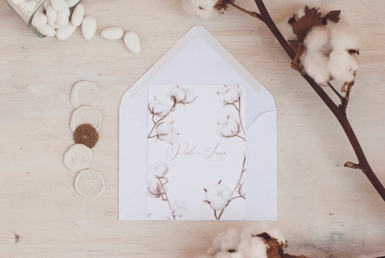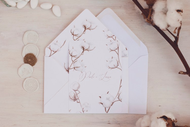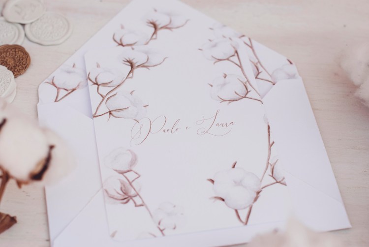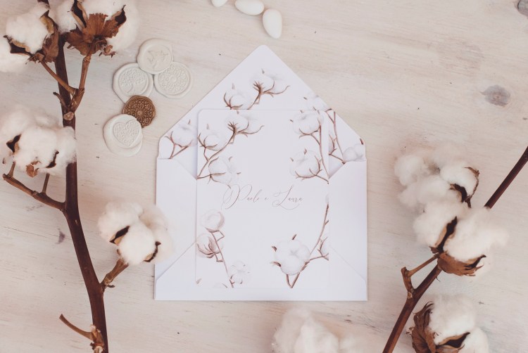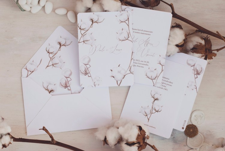 Partecipazioni con illustrazioni ad acquerello di fiori di cotone; è un coordinato per coppie che amano uno stile elegante e delicato.