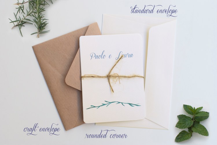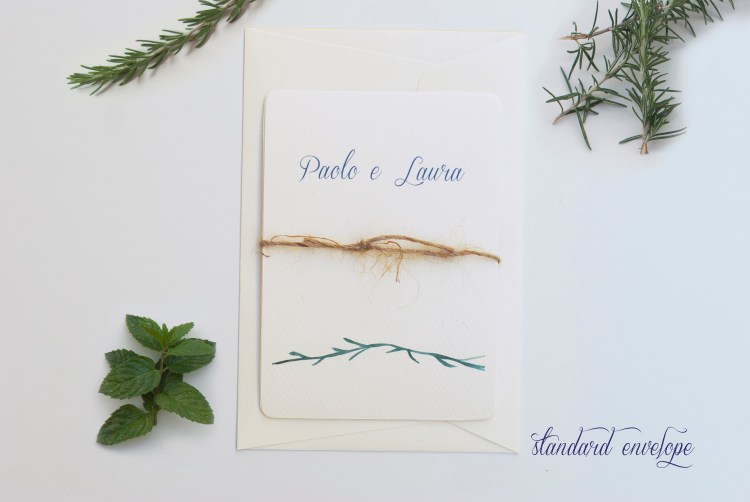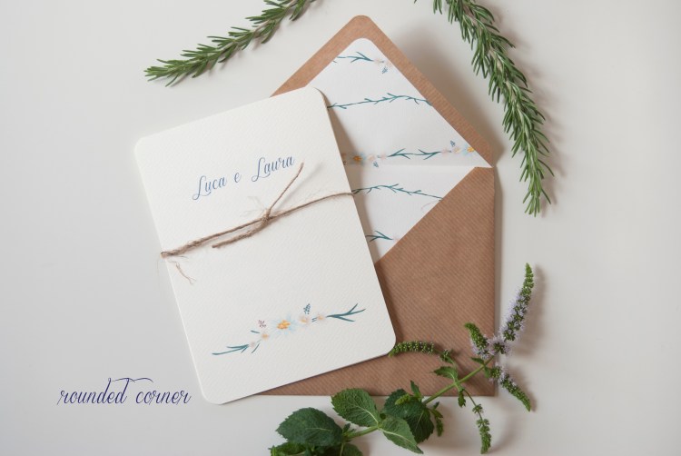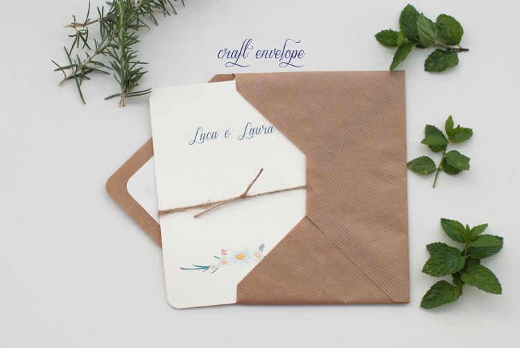 É possibile inserire la partecipazione in una busta realizzata artigianalmente con carta craft rivestita all’interno con una texture di fiori e frutti di alta montagna, oppure, in una busta standard coordinata al cartoncino della partecipazione.