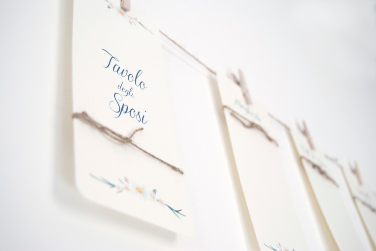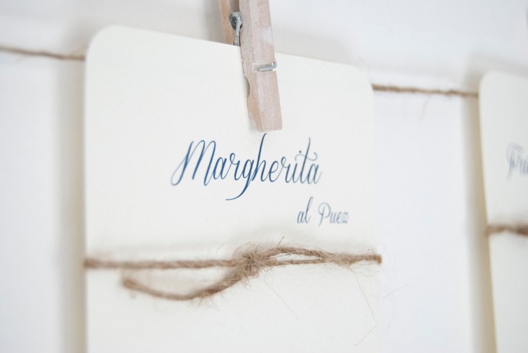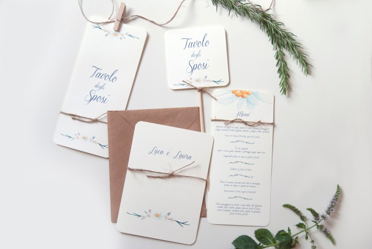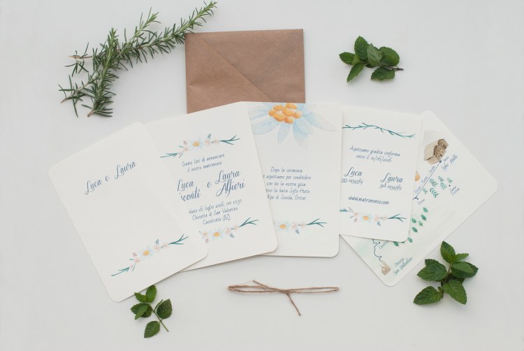 Ogni pagina della partecipazione è stampata su cartoncino bianco groffato Favini Prisma. Le pagine sono tenute insieme da un fiocco di spago.
