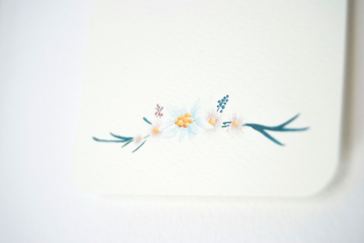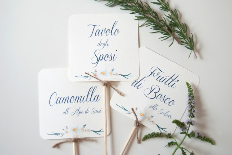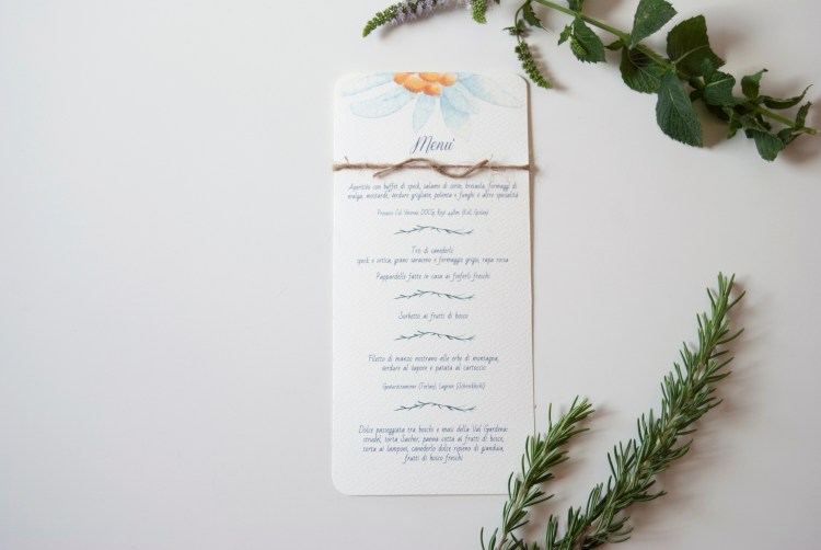 Coordinato a tema floreale con stampa di illustrazione ad acquerello di fiori e frutti di alta montagna; adatta per un matrimonio in montagna o per coppie semplici che amano uno stile rustico ma ricercato.