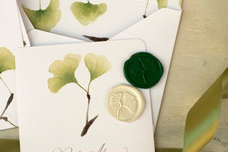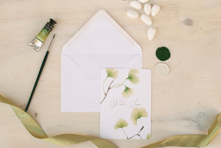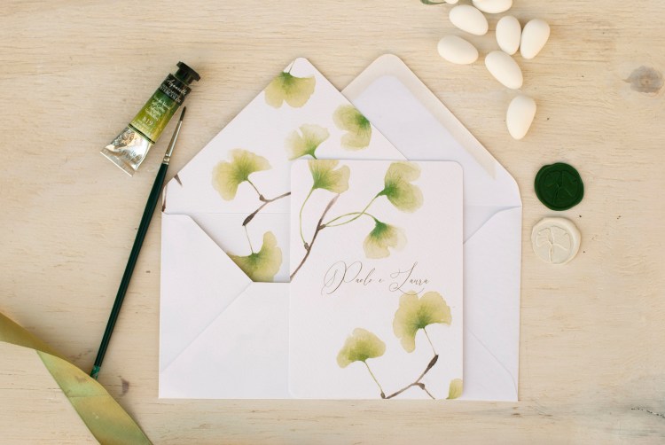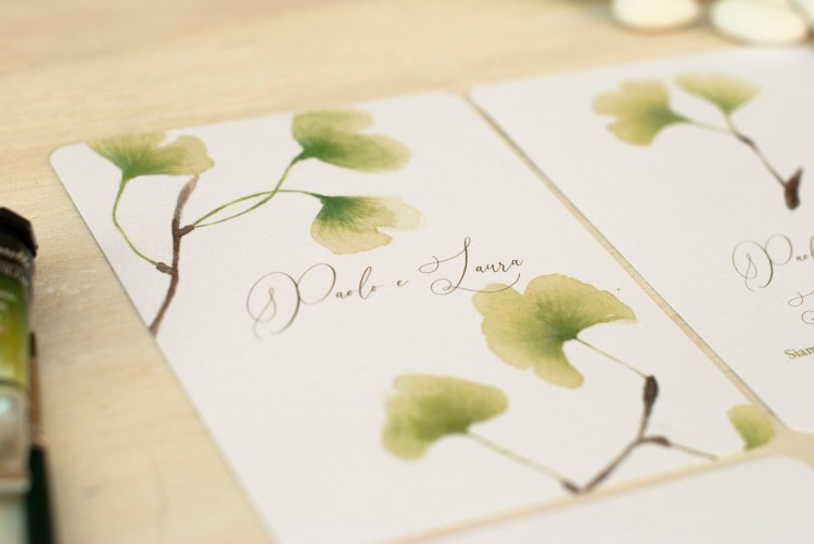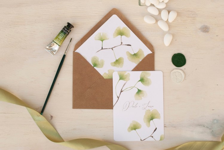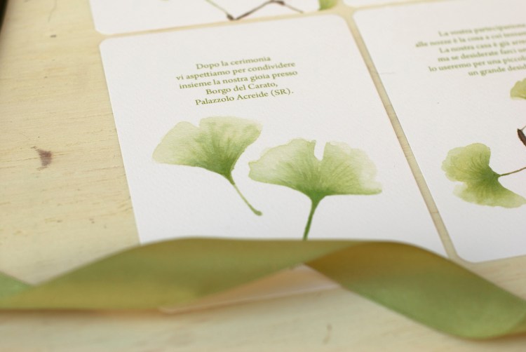 Partecipazioni a tema greenery con illustrazioni ad acquerello di foglie di ginko; è un coordinato per coppie che amano uno stile elegante e delicato.