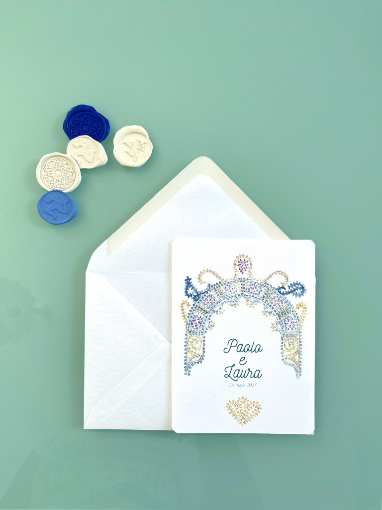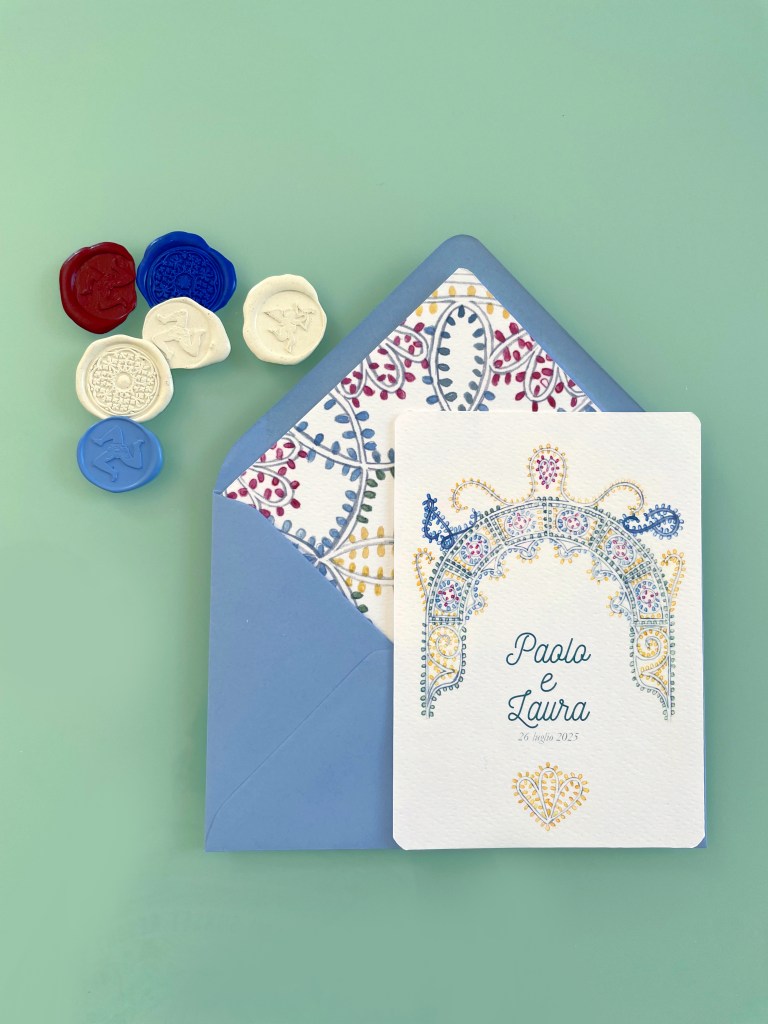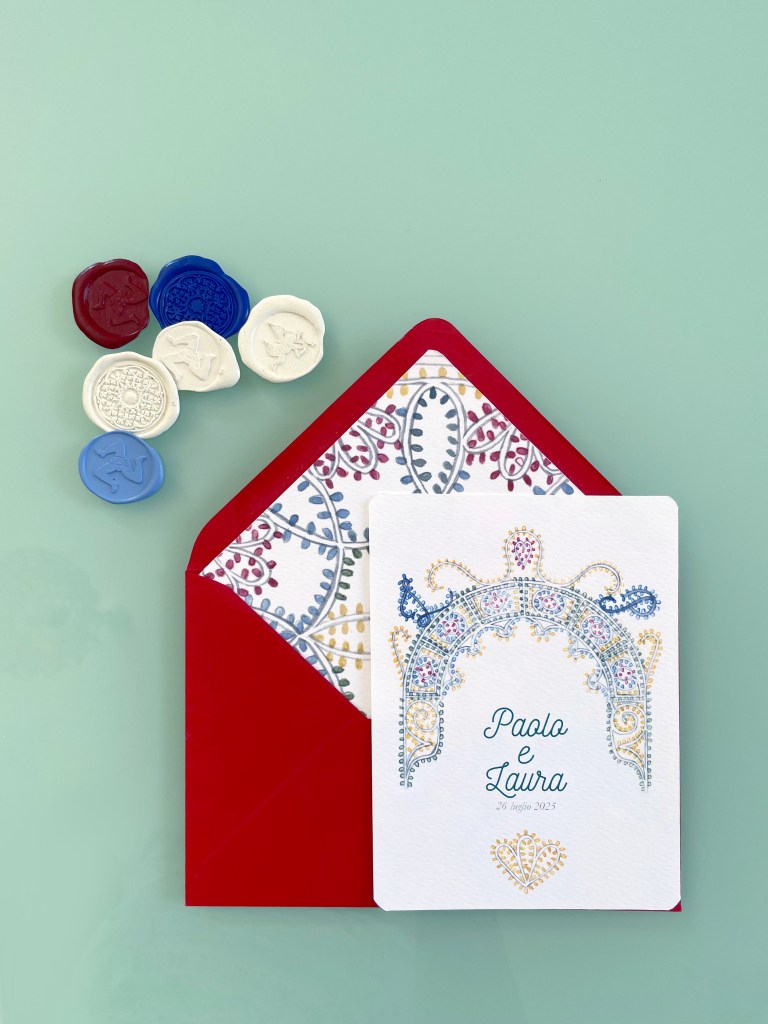 Partecipazioni a tema siciliano con illustrazioni ad acquerello delle luminarie tipiche delle feste patronali; è un coordinato per coppie che amano uno stile elegante e delicato ma vogliono comunque un tema legato alla sicilia.