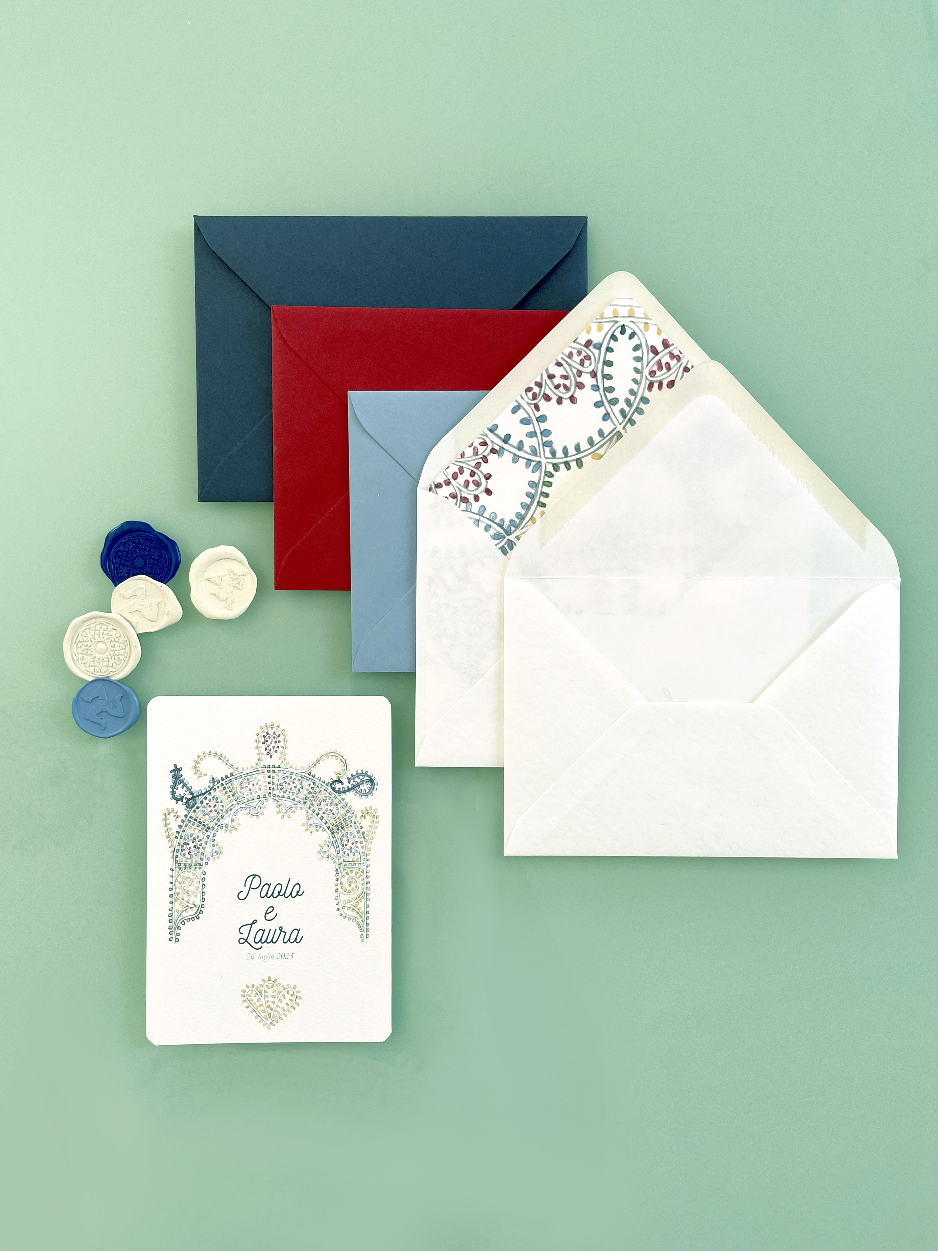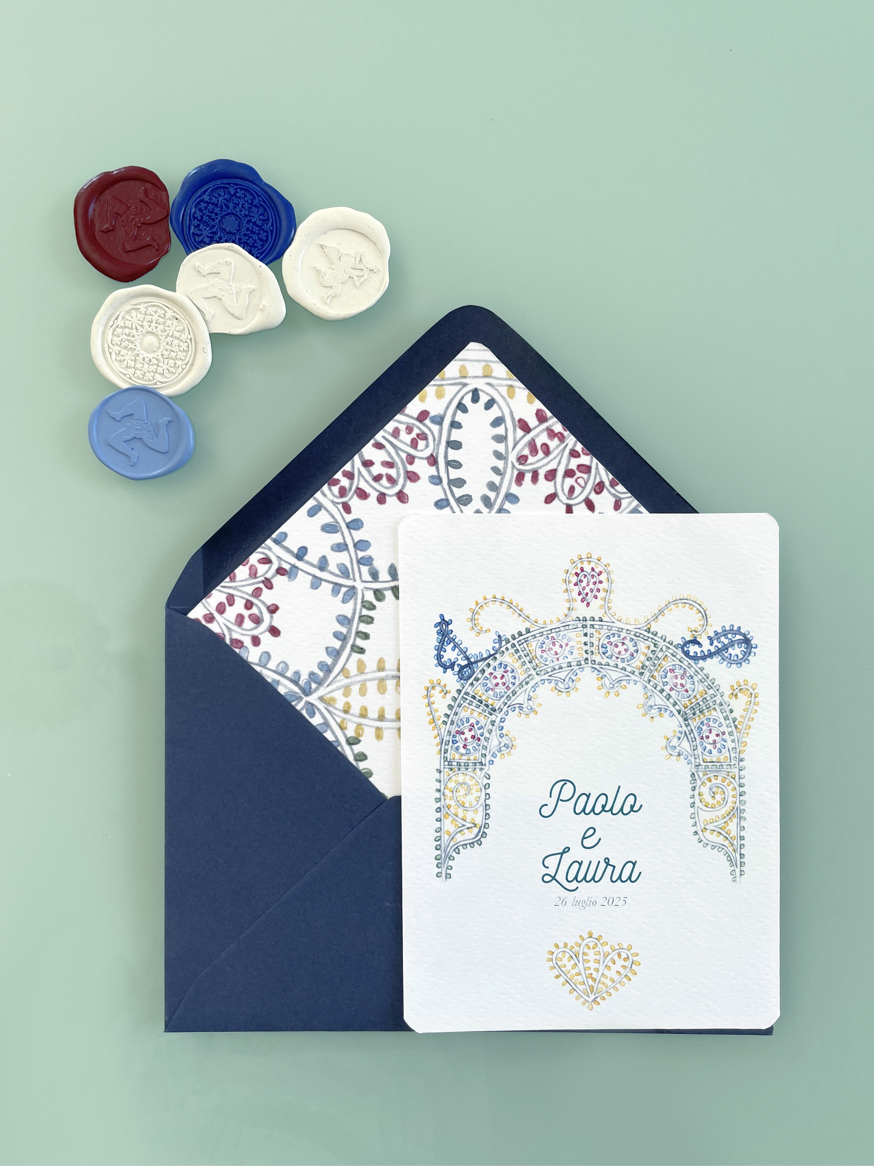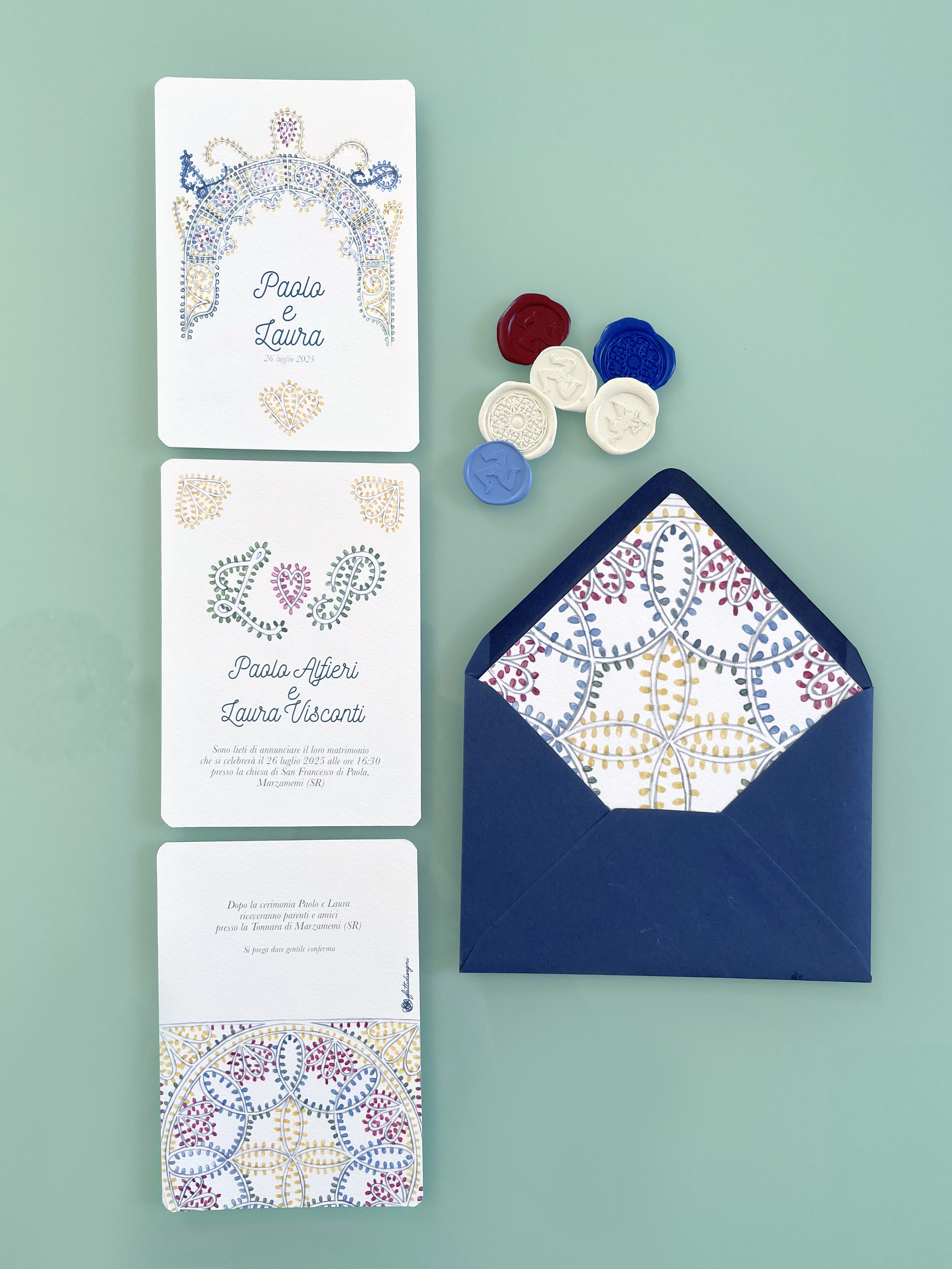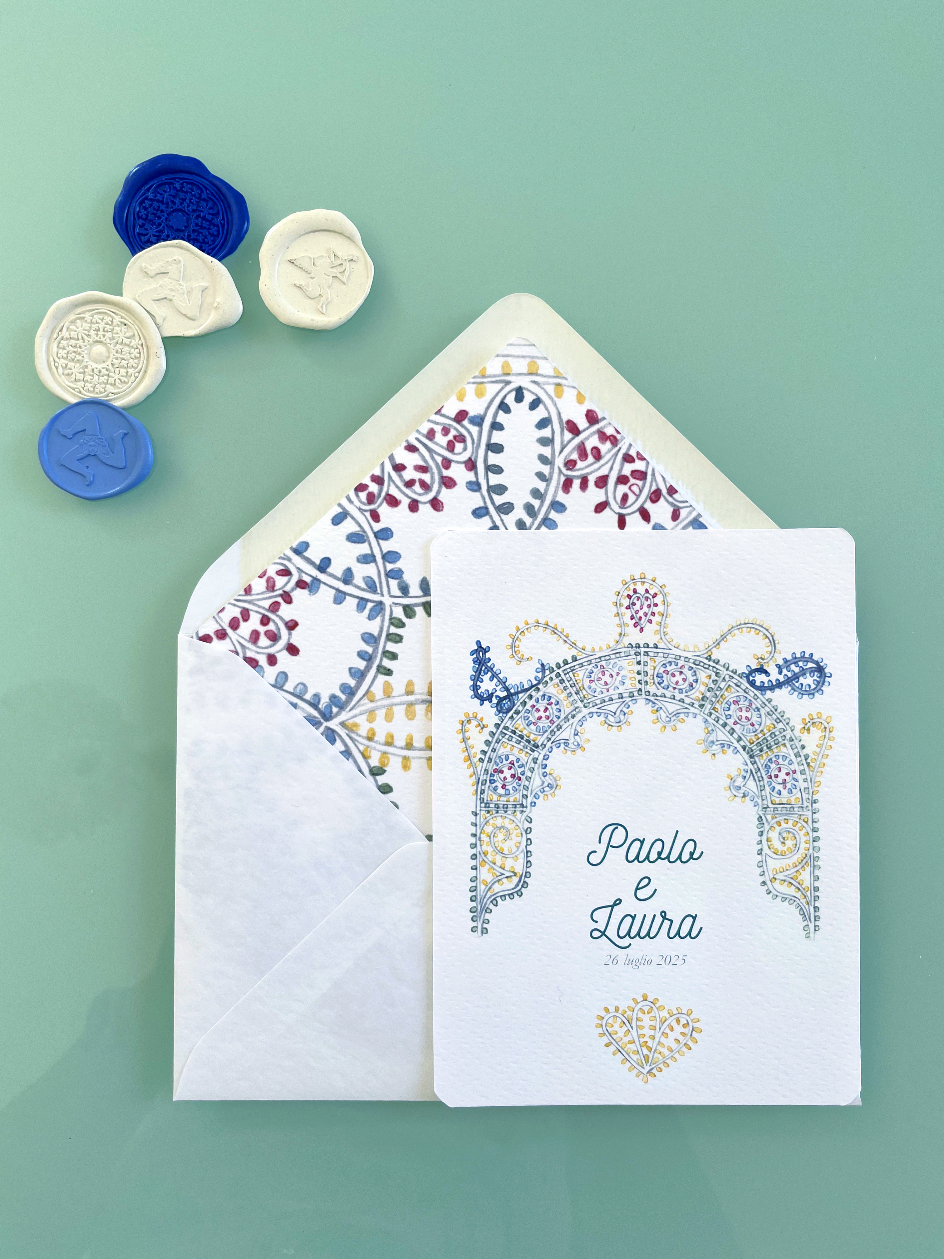 Partecipazioni a tema siciliano con illustrazioni ad acquerello delle luminarie tipiche delle feste patronali; è un coordinato per coppie che amano uno stile elegante e delicato ma vogliono comunque un tema legato alla sicilia.