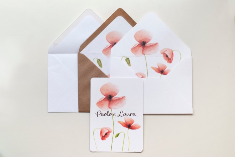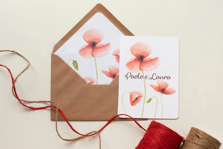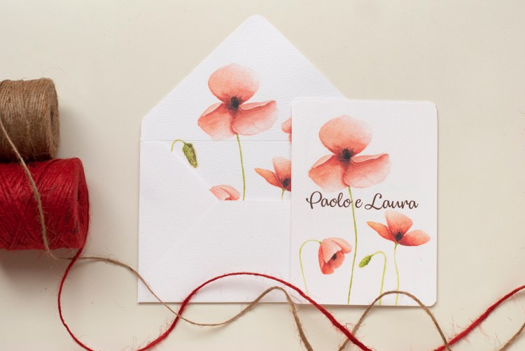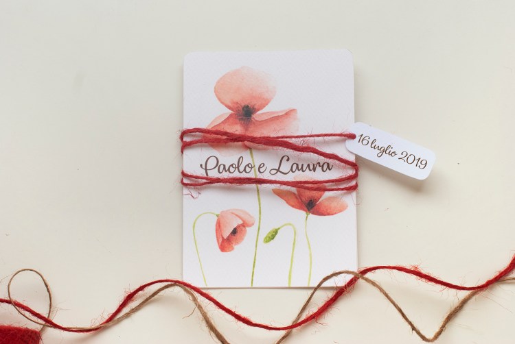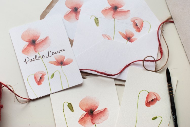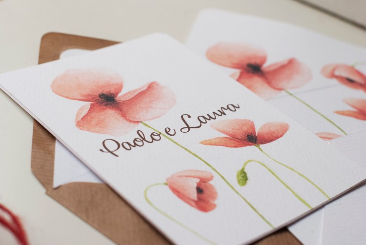Partecipazioni a tema floreale con illustrazioni ad acquerello di fiori di papavero; è un coordinato per coppie che amano uno stile rustico elegante e ricercato.