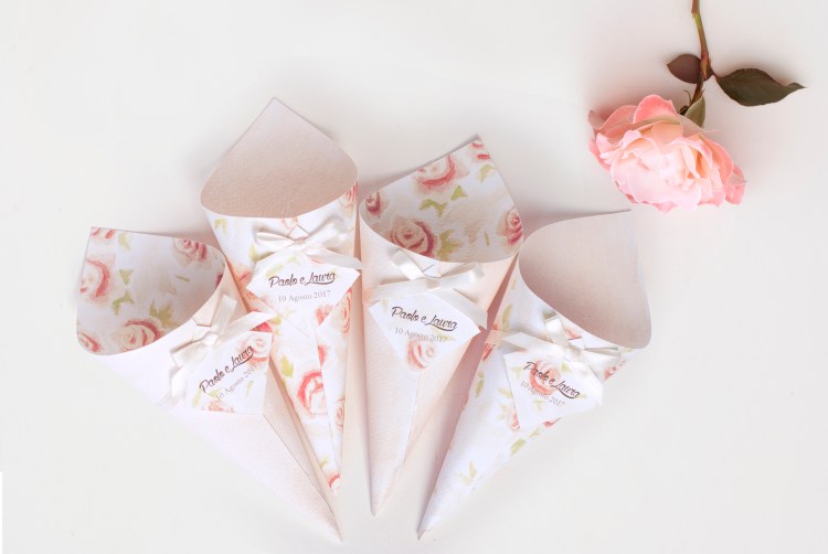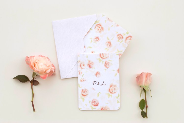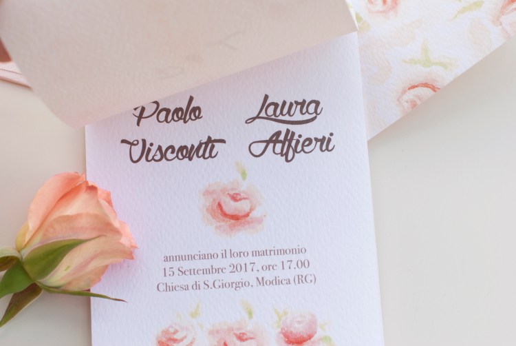 Ogni pagina della partecipazione è stampata su cartoncino bianco groffato Favini Prisma. Le pagine di cui è composta sono: copertina, partecipazione, invito al ristorante, indicazioni per lista nozze. É possibile arricchire la partecipazione con la mappa e le indicazioni stradali per raggiungere chiesa e ristorante e stondare gli angoli. La partecipazione può essere inserita in una busta artigianale stampata di rosa cipria ad acquerello sull’esterno mentre all’interno presenta un motivo di roselline rosa oppure in una busta standard coordinata al cartoncino della partecipazione.