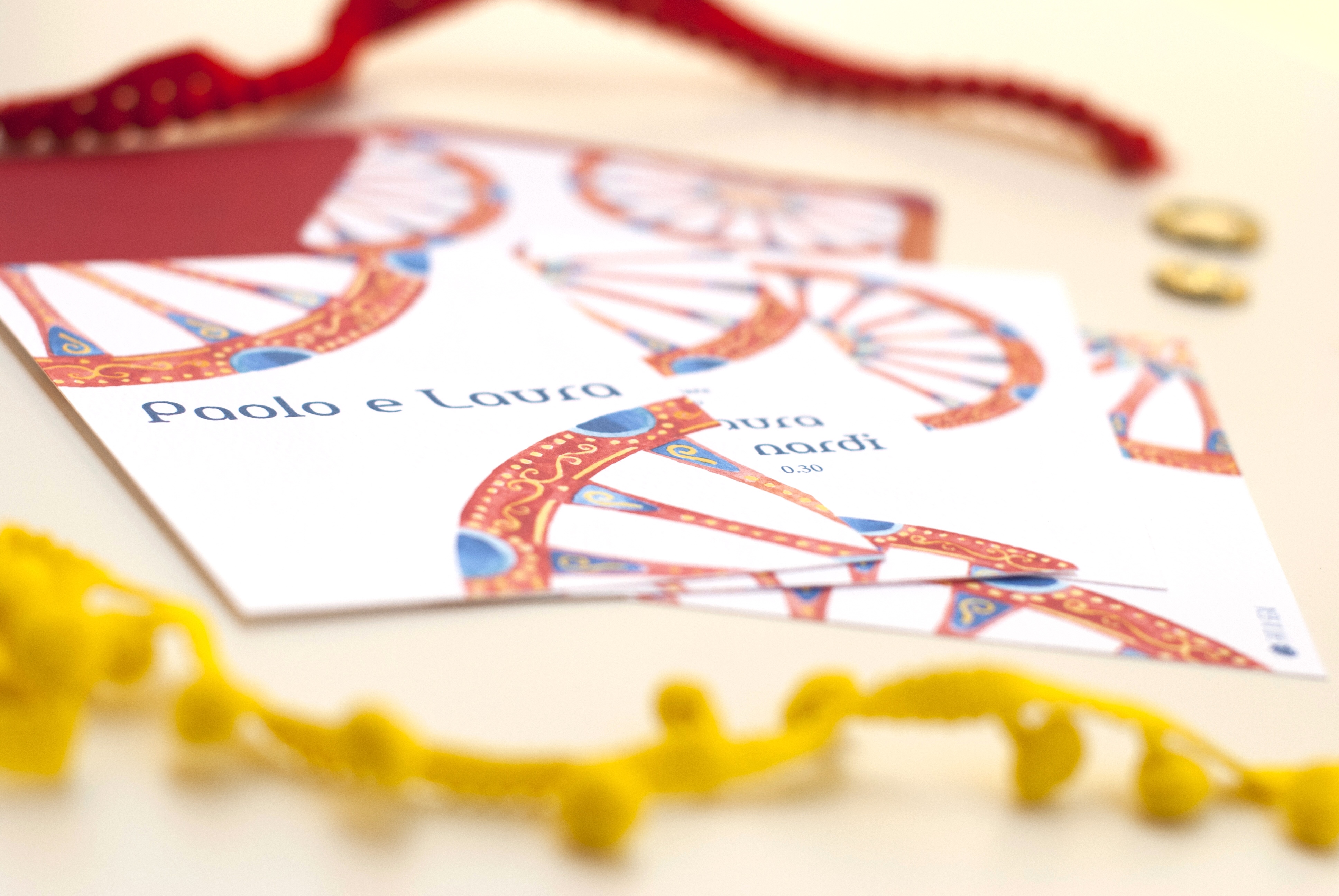 Oltre la busta bianca standard puoi scegliere delle altre opzioni per la busta: la busta rossa o gialla rivestita internamente dalla stampa della texture del tema o la busta bianca artigianale con la stampa del tema all’interno.