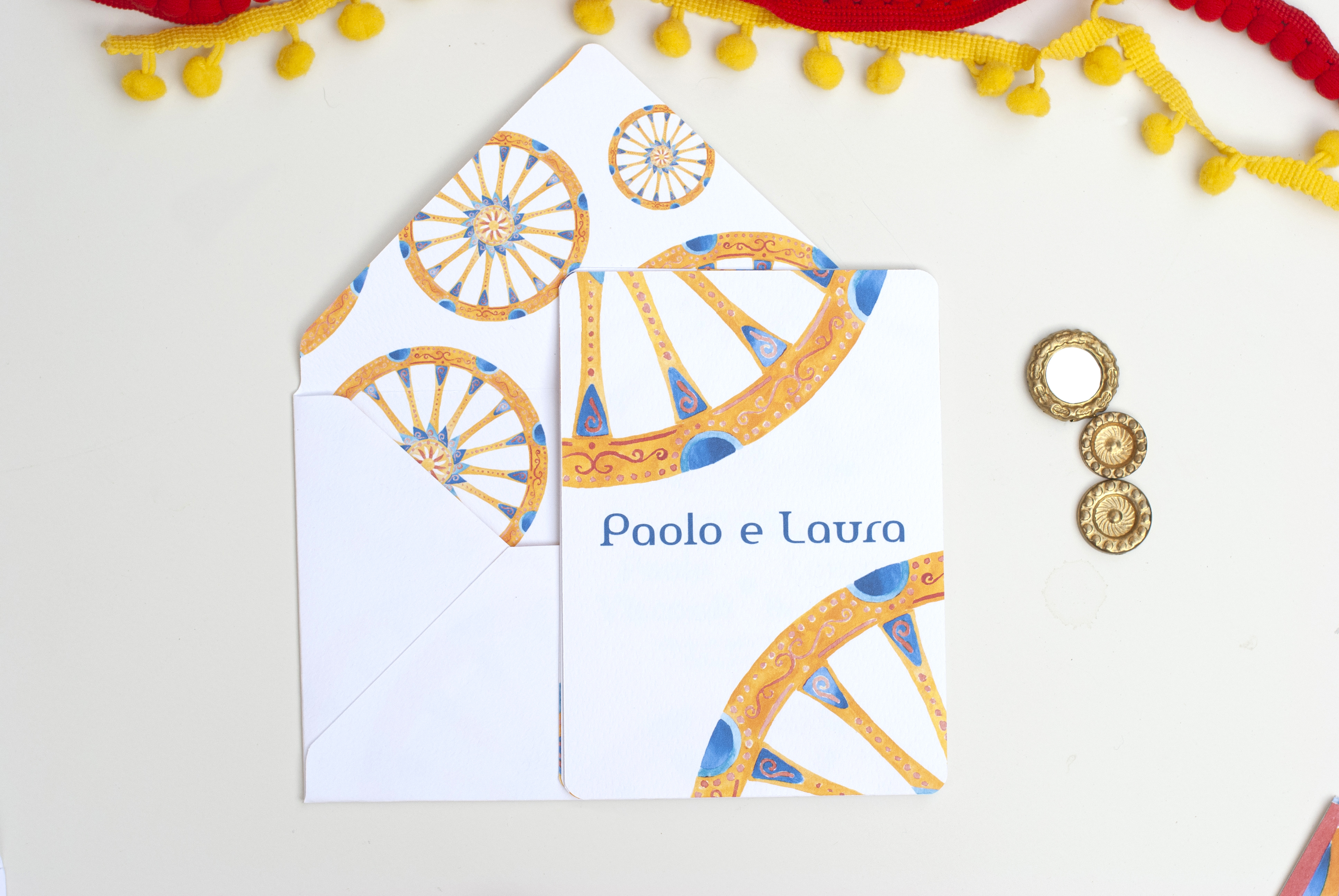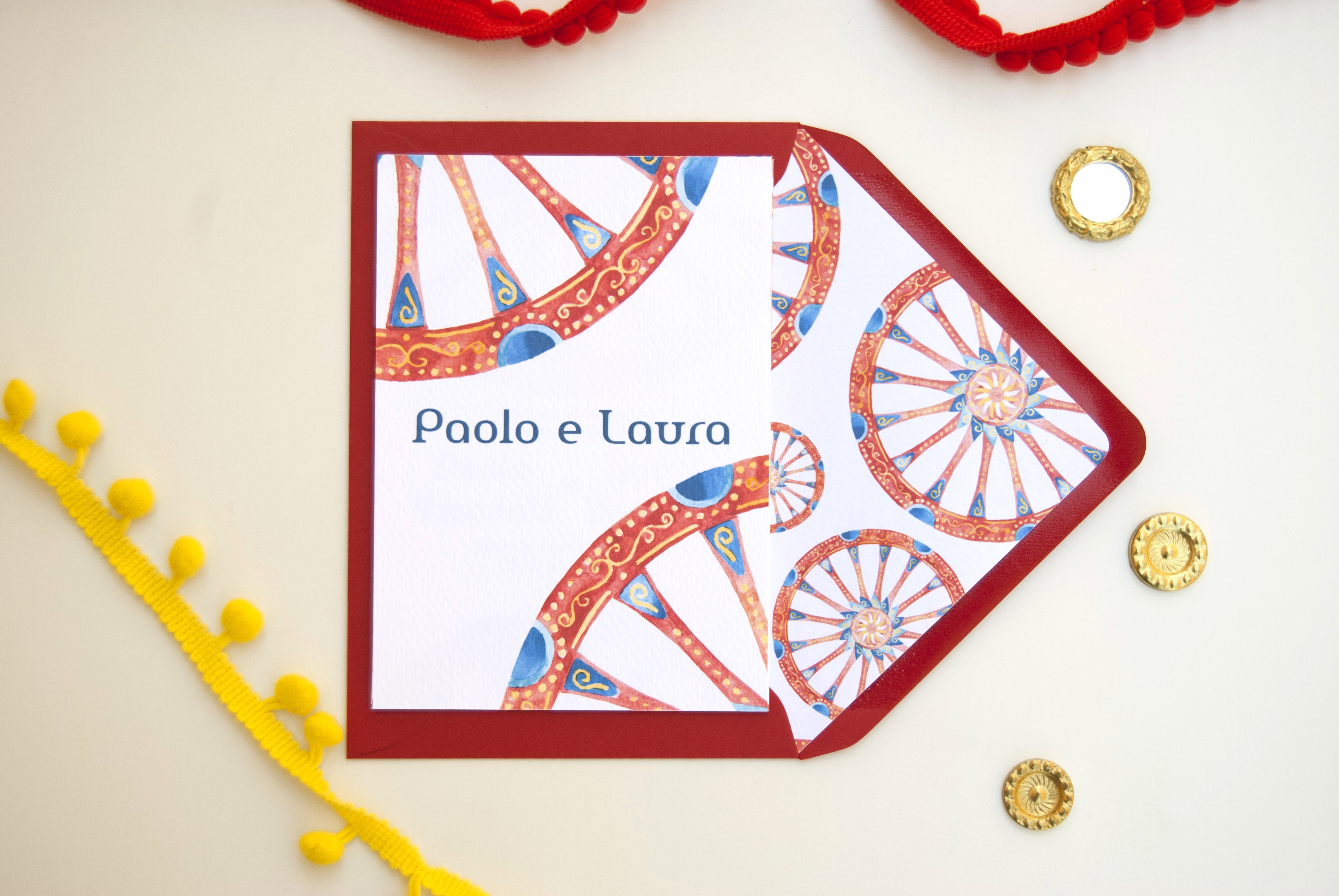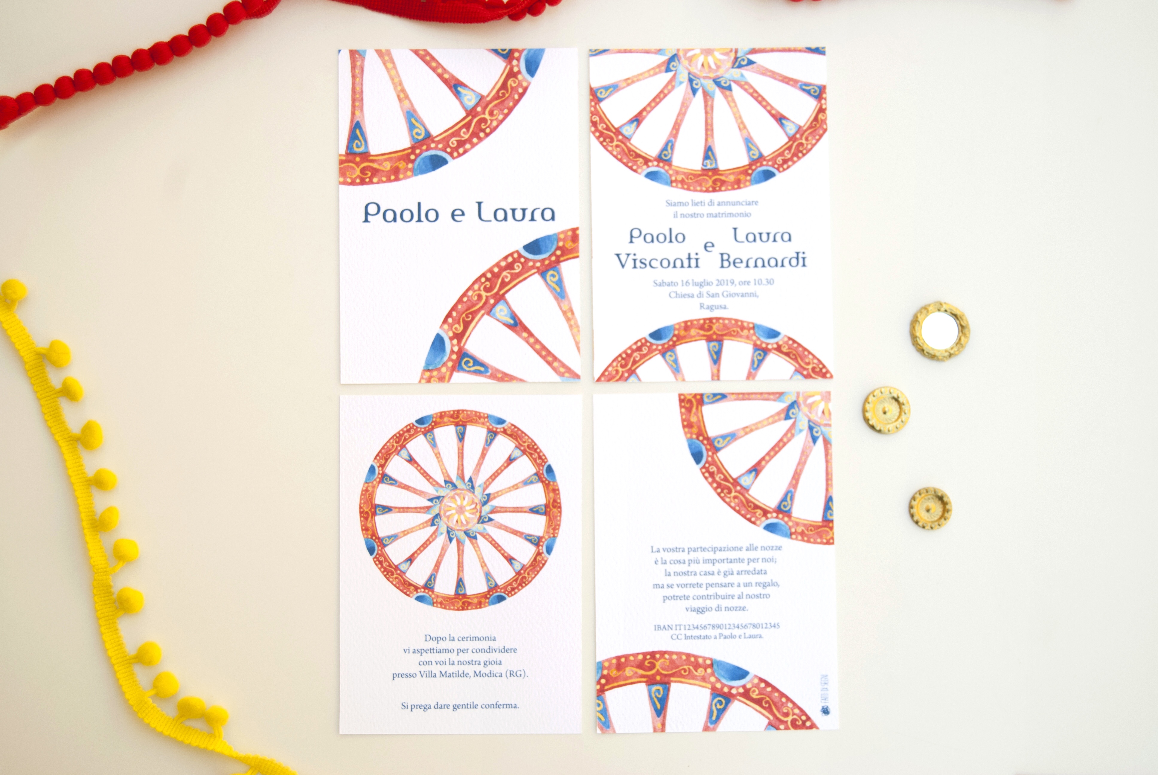 Partecipazione con le stampe di illustrazioni ad acquerello delle ruote di carretto Siciliano; è particolarmente adatta per un matrimonio in Sicilia o per coppie innamorate dell’isola. Ogni pagina della partecipazione è stampata su cartoncino bianco groffato Favini Prisma. La partecipazione include la copertina, la partecipazione, l’invito al ristorante, le istruzioni per la lista nozze o regalo in denaro e la busta standard, ma è possibile aggiungere: