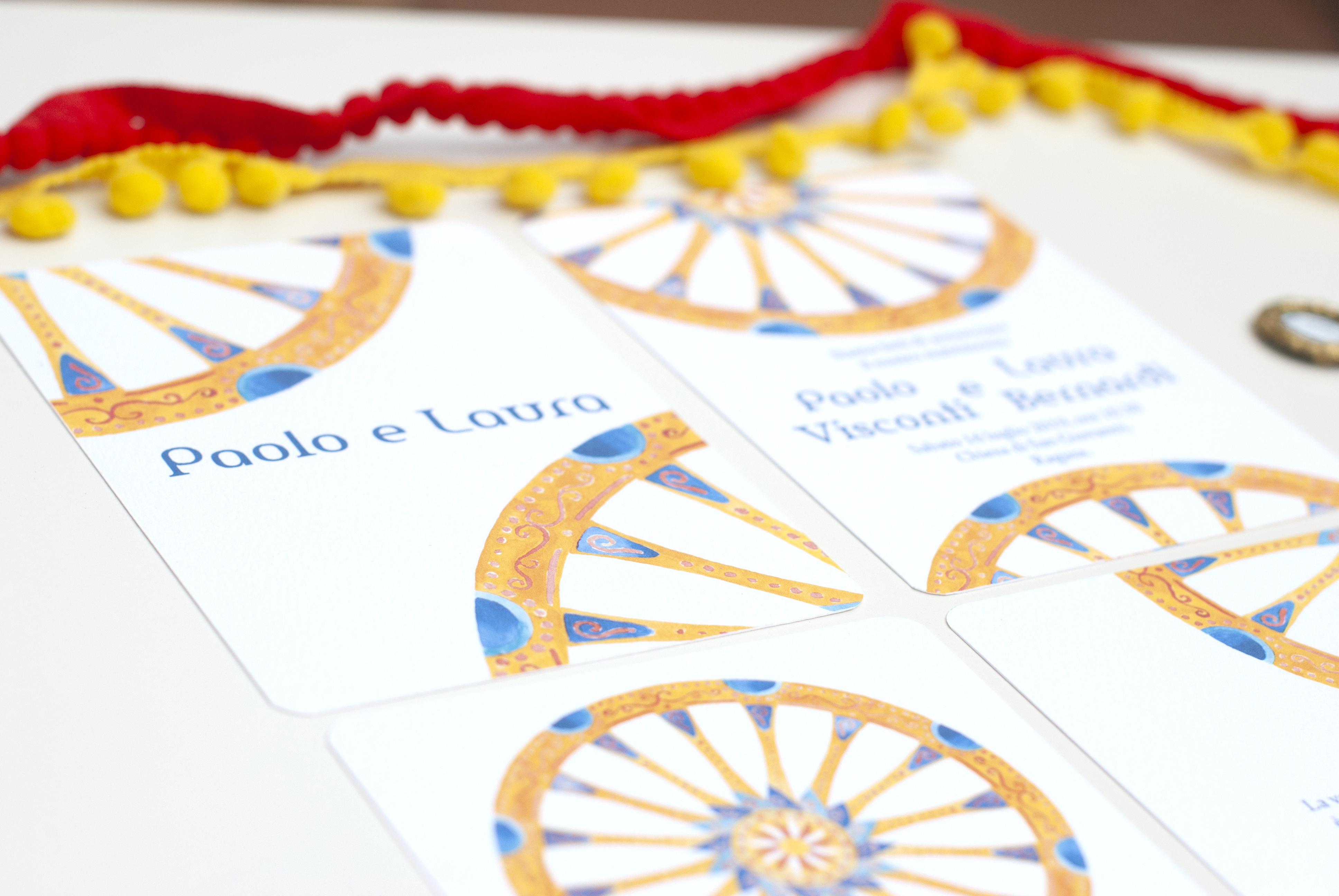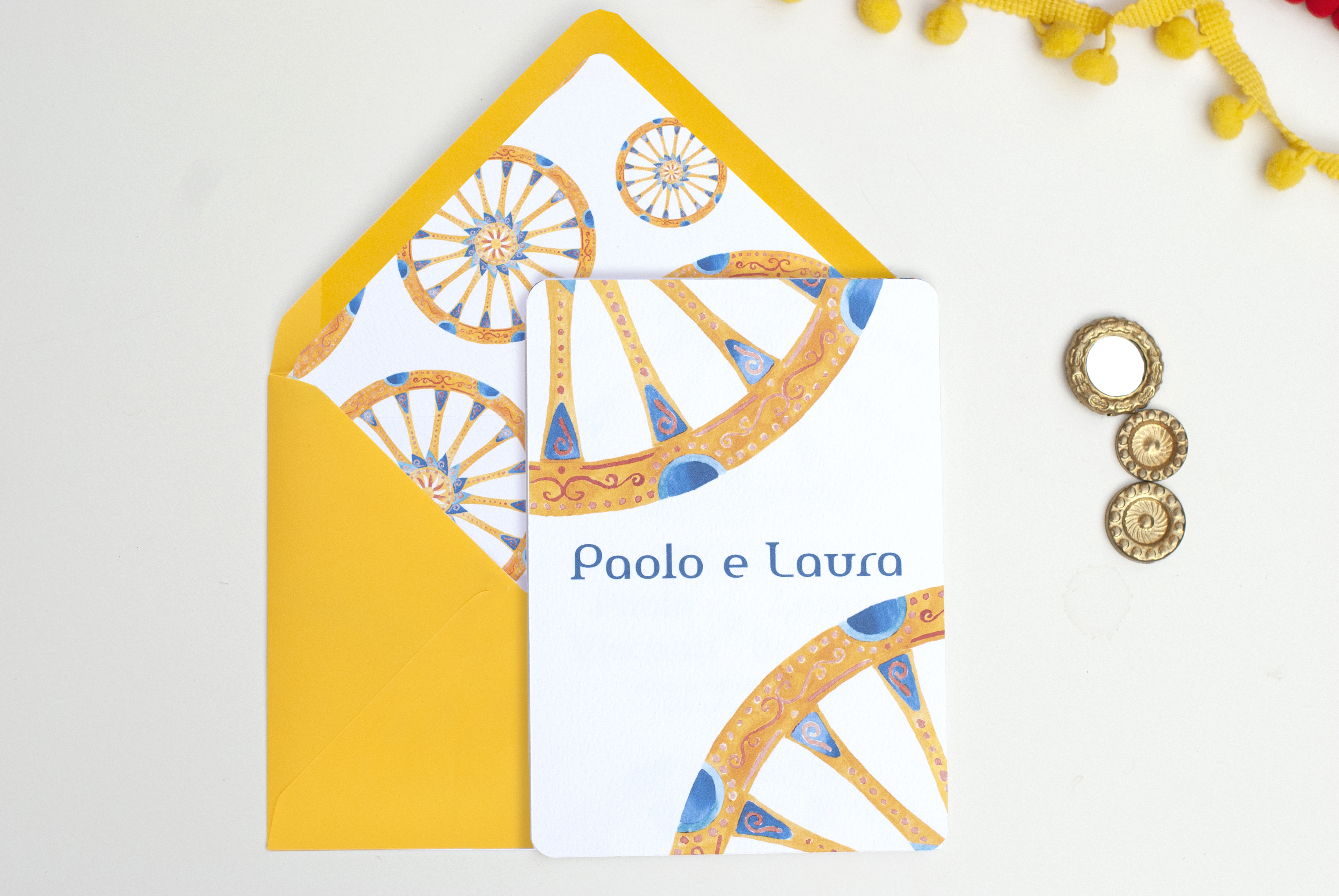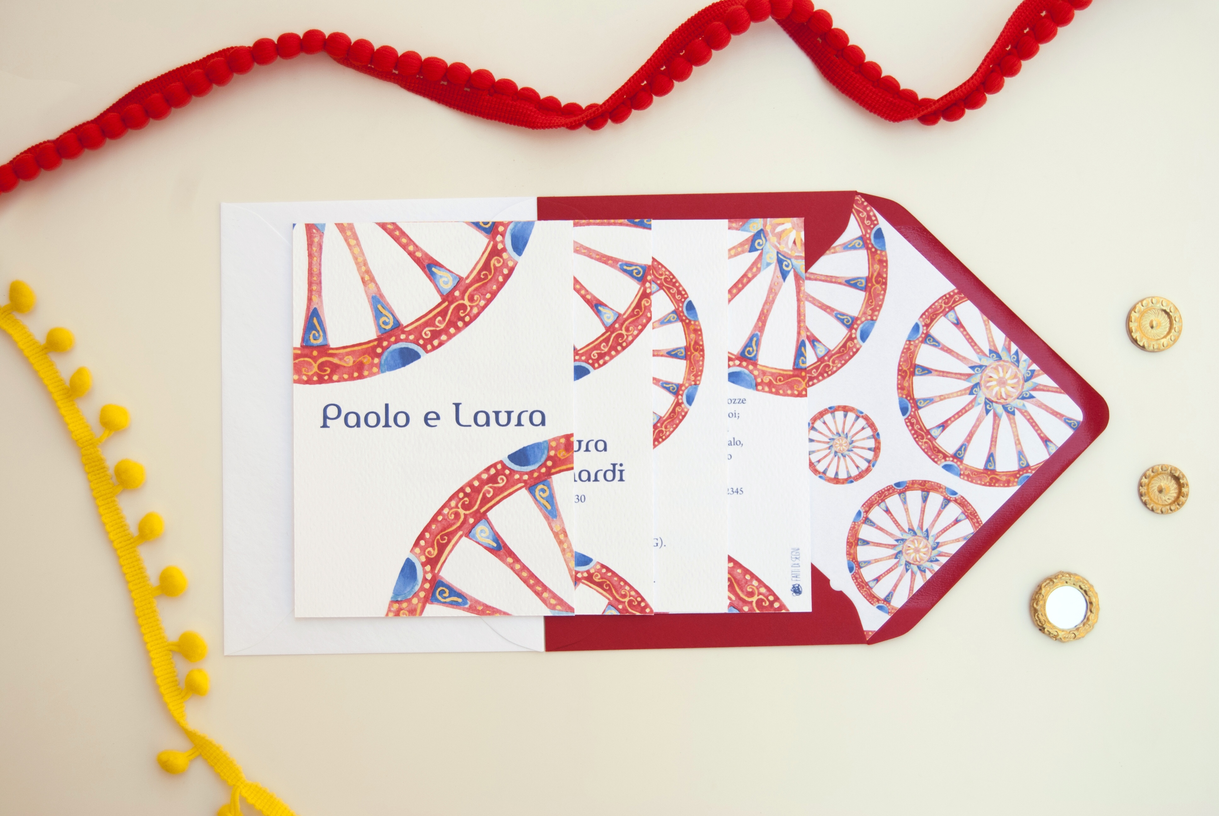 Partecipazione con le stampe di illustrazioni ad acquerello delle ruote di carretto Siciliano; è particolarmente adatta per un matrimonio in Sicilia o per coppie innamorate dell’isola. Ogni pagina della partecipazione è stampata su cartoncino bianco groffato Favini Prisma. La partecipazione include la copertina, la partecipazione, l’invito al ristorante, le istruzioni per la lista nozze o regalo in denaro e la busta standard, ma è possibile aggiungere: