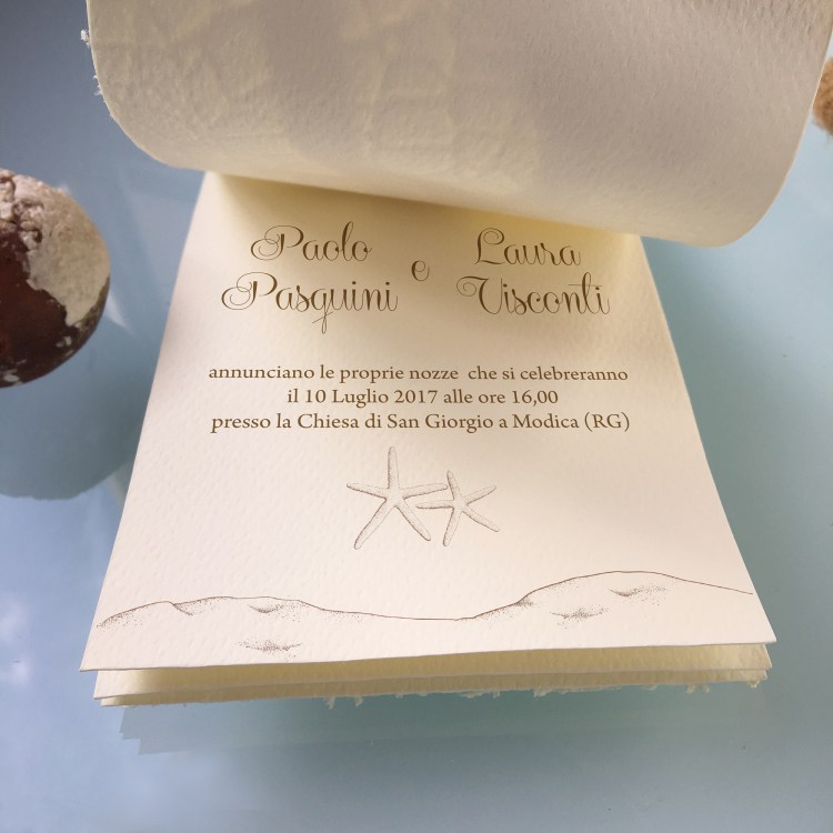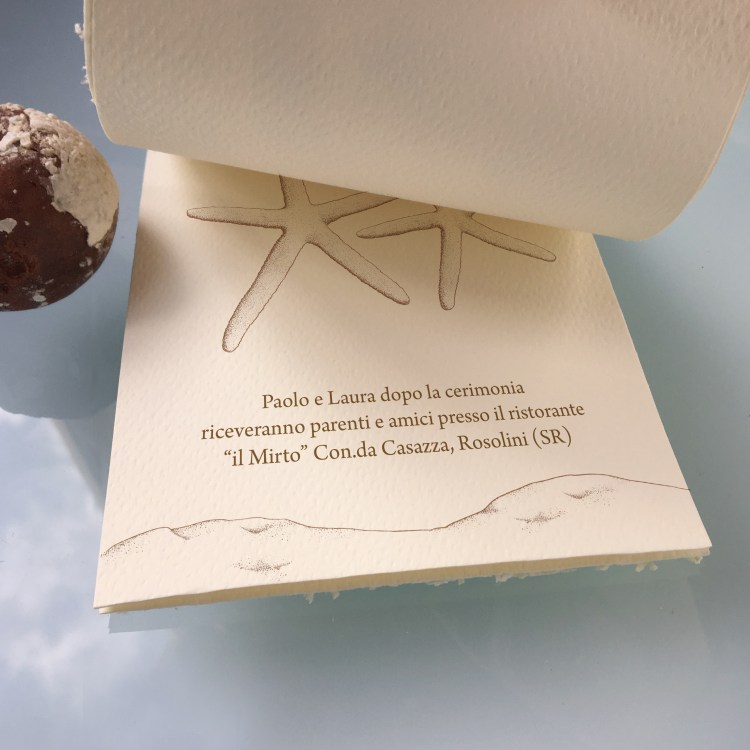 La partecipazione è stampata su carta Favini e accoppiata a rete grezza; decorazione con nastro tortora e stella marina.
