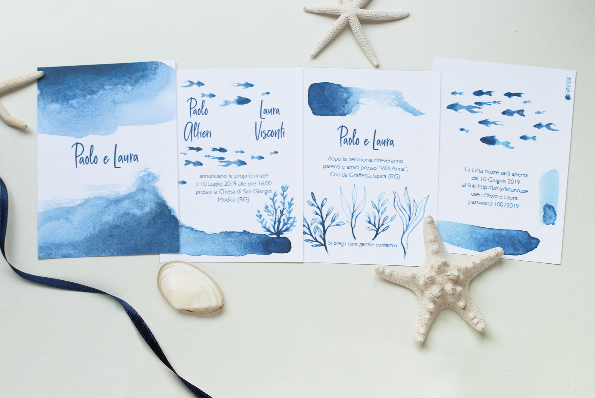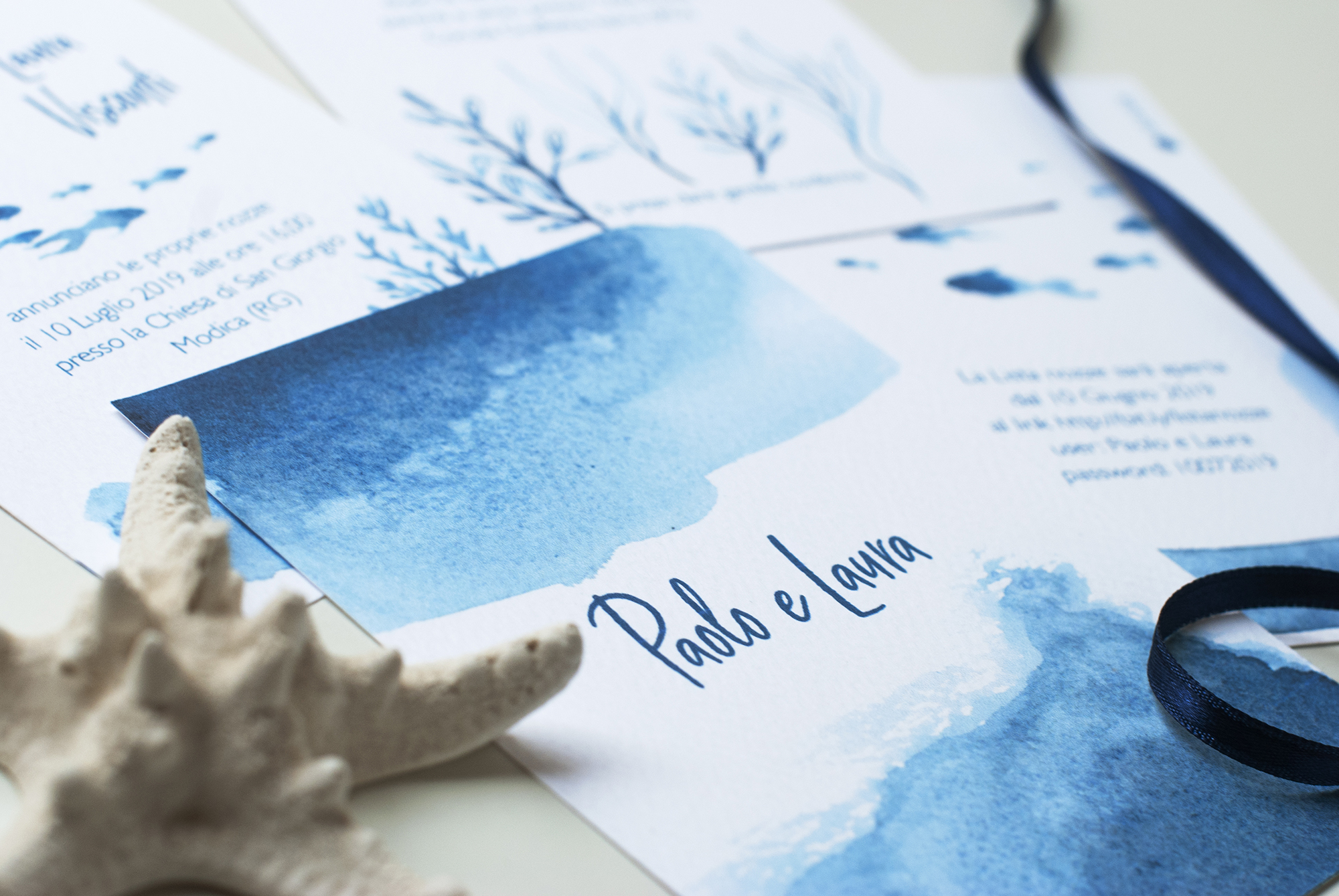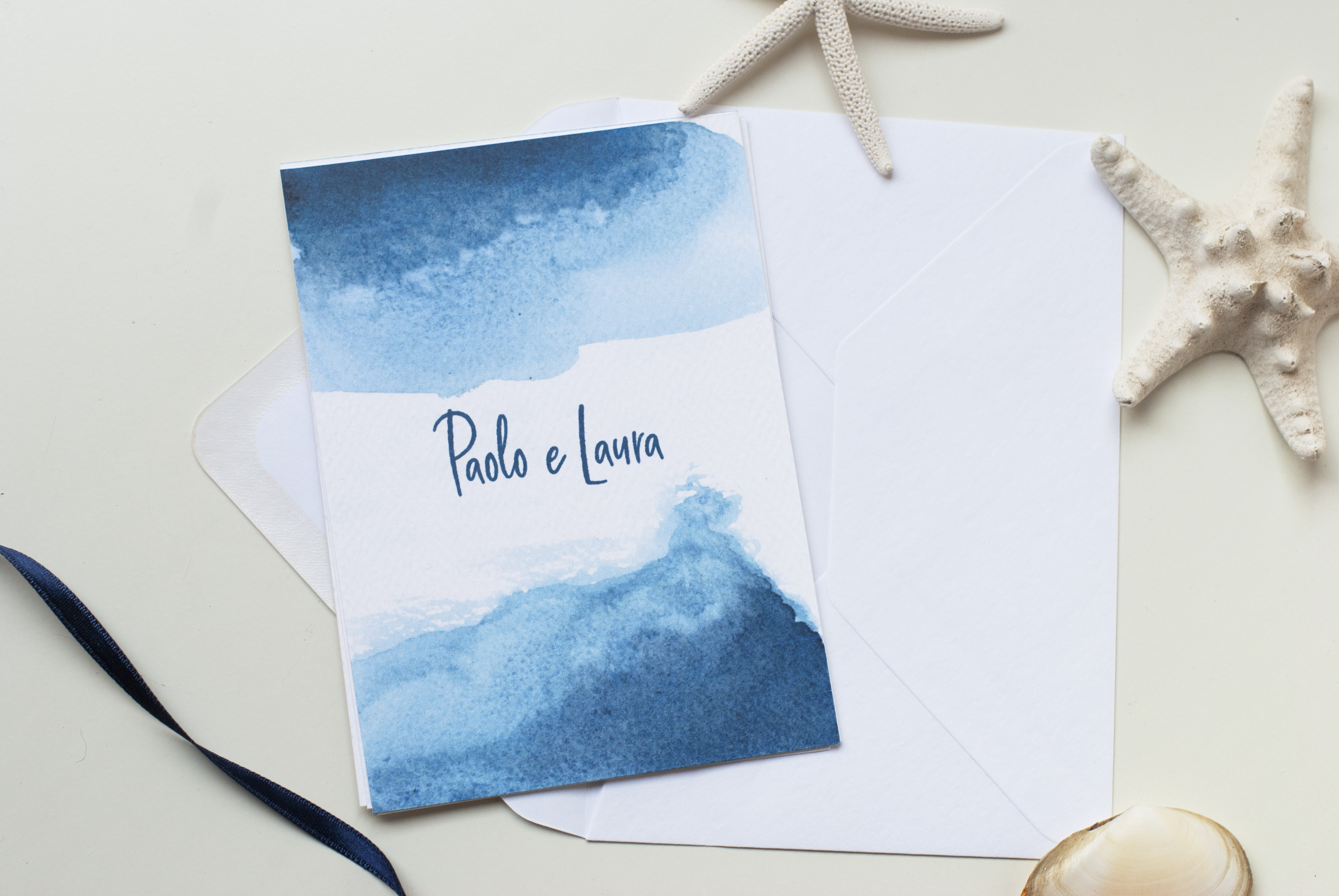 É possibile scegliere il tipo di busta per completare la partecipazione, tra una busta realizzata artigianalmente in carta blu rivestita all’interno con una texture marina, oppure, una busta standard coordinata al cartoncino della partecipazione.