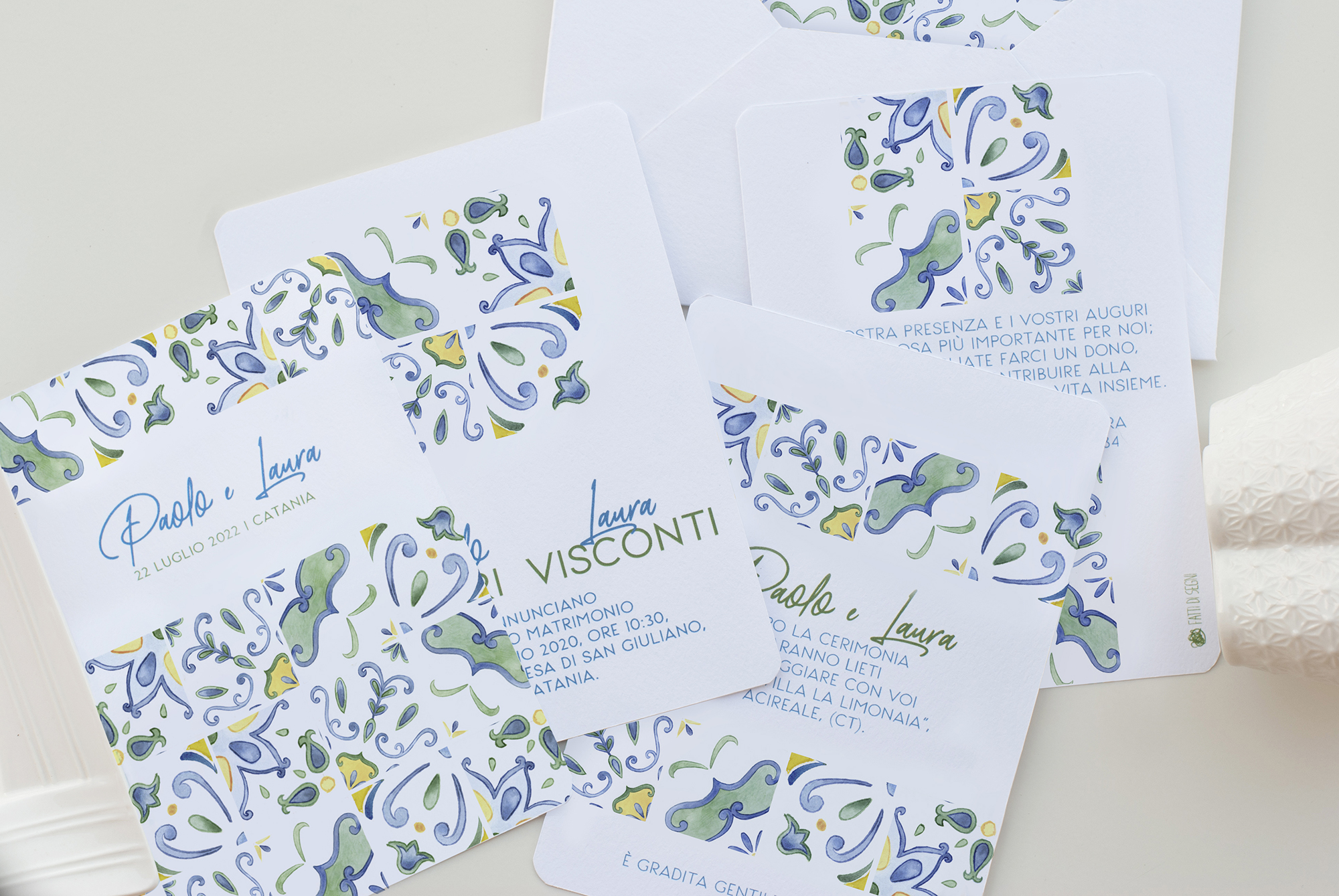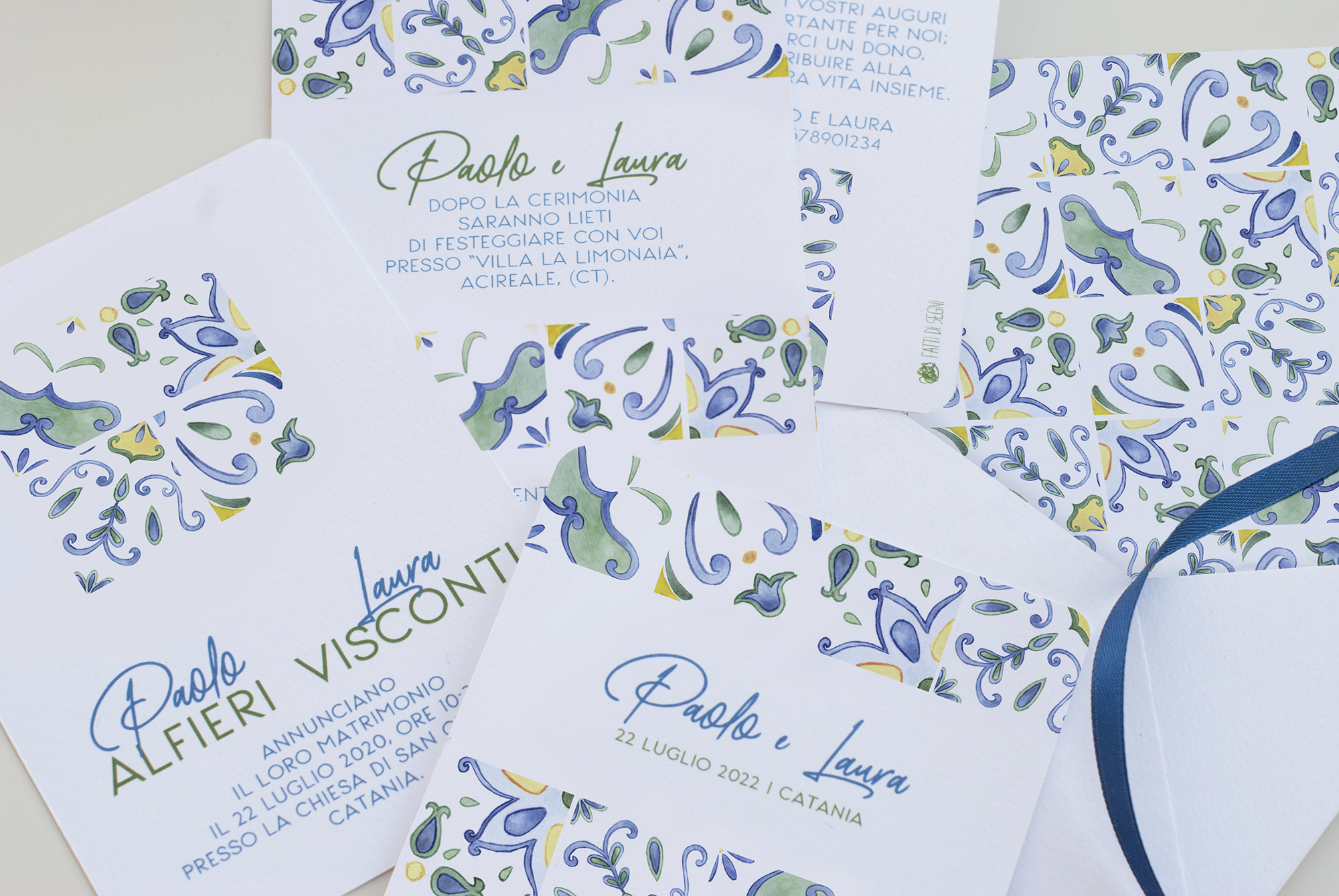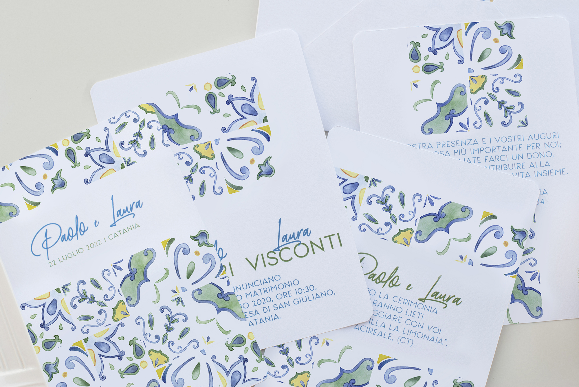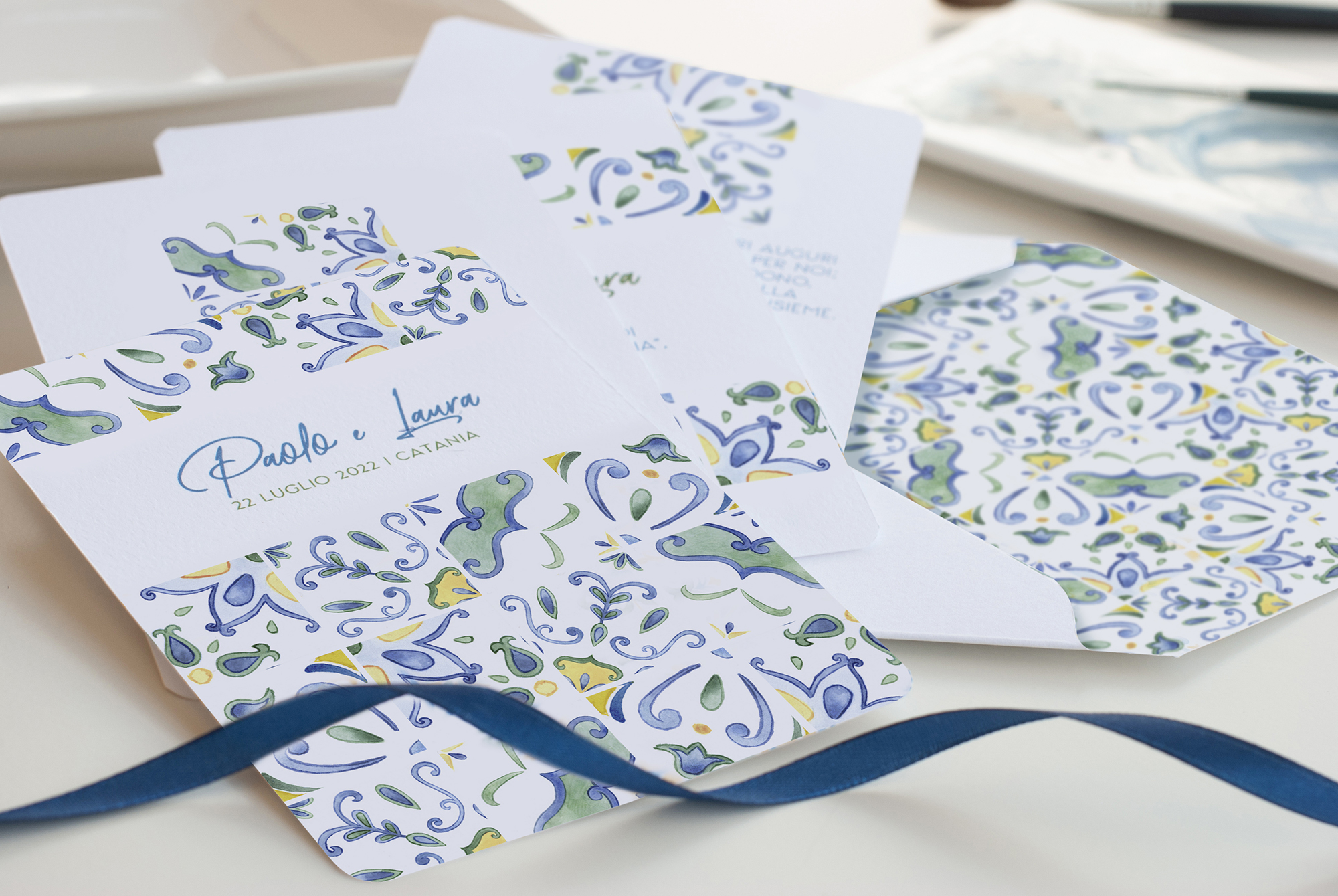 Partecipazione con le stampe di illustrazioni ad acquerello delle ceramiche siciliane; è particolarmente adatta per un matrimonio in Sicilia o per coppie innamorate dell’isola. Ogni pagina della partecipazione è stampata su cartoncino bianco goffrato Favini Prisma. La partecipazione include la copertina, la partecipazione, l’invito al ristorante, le istruzioni per la lista nozze o regalo in denaro e la busta standard, ma è possibile aggiungere: mappa illustrata con le indicazioni per raggiungere la chiesa e il ristorante, calligrafia sulle buste, chiusura in ceralacca.