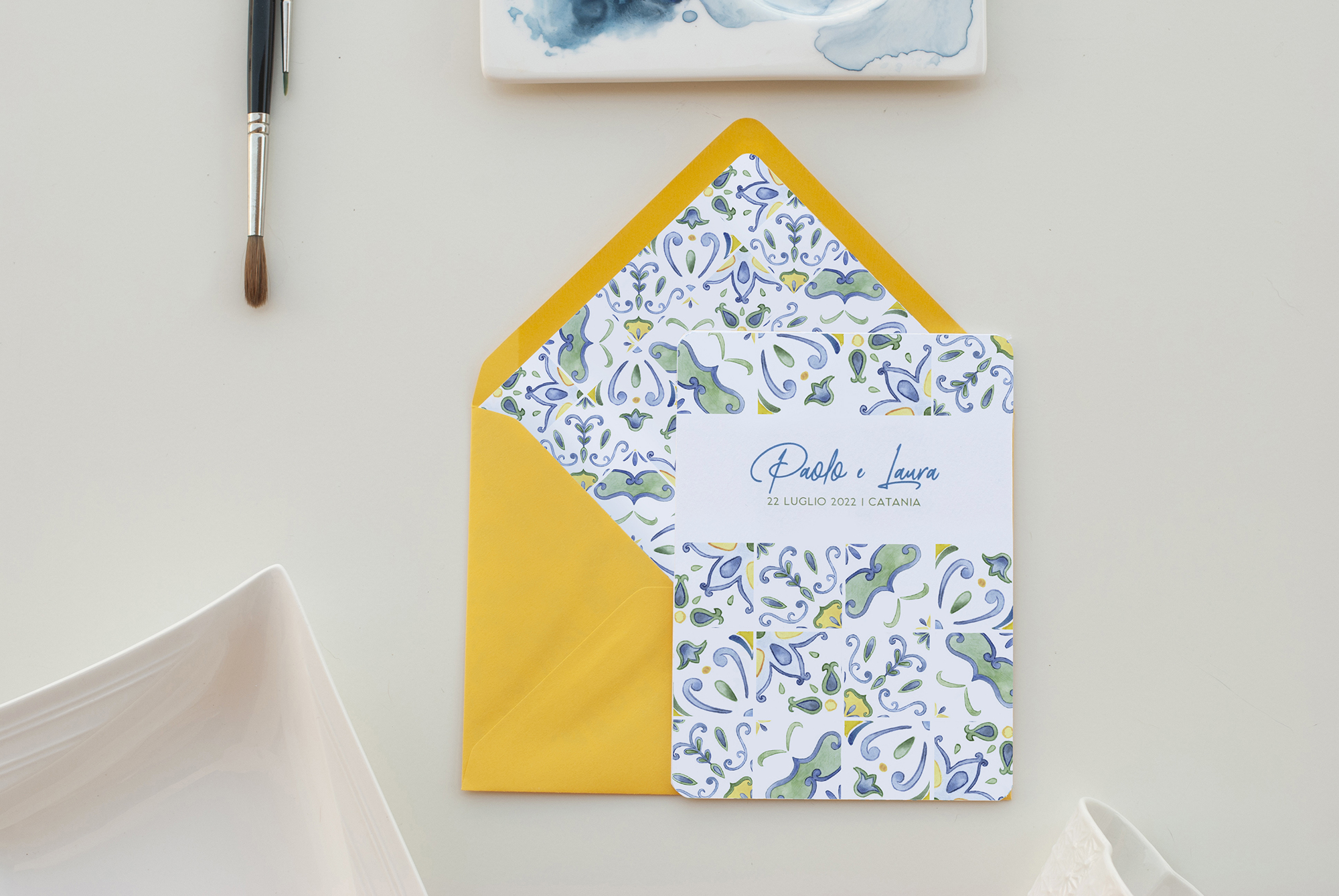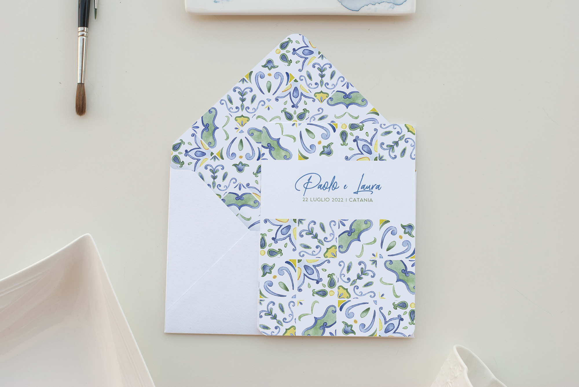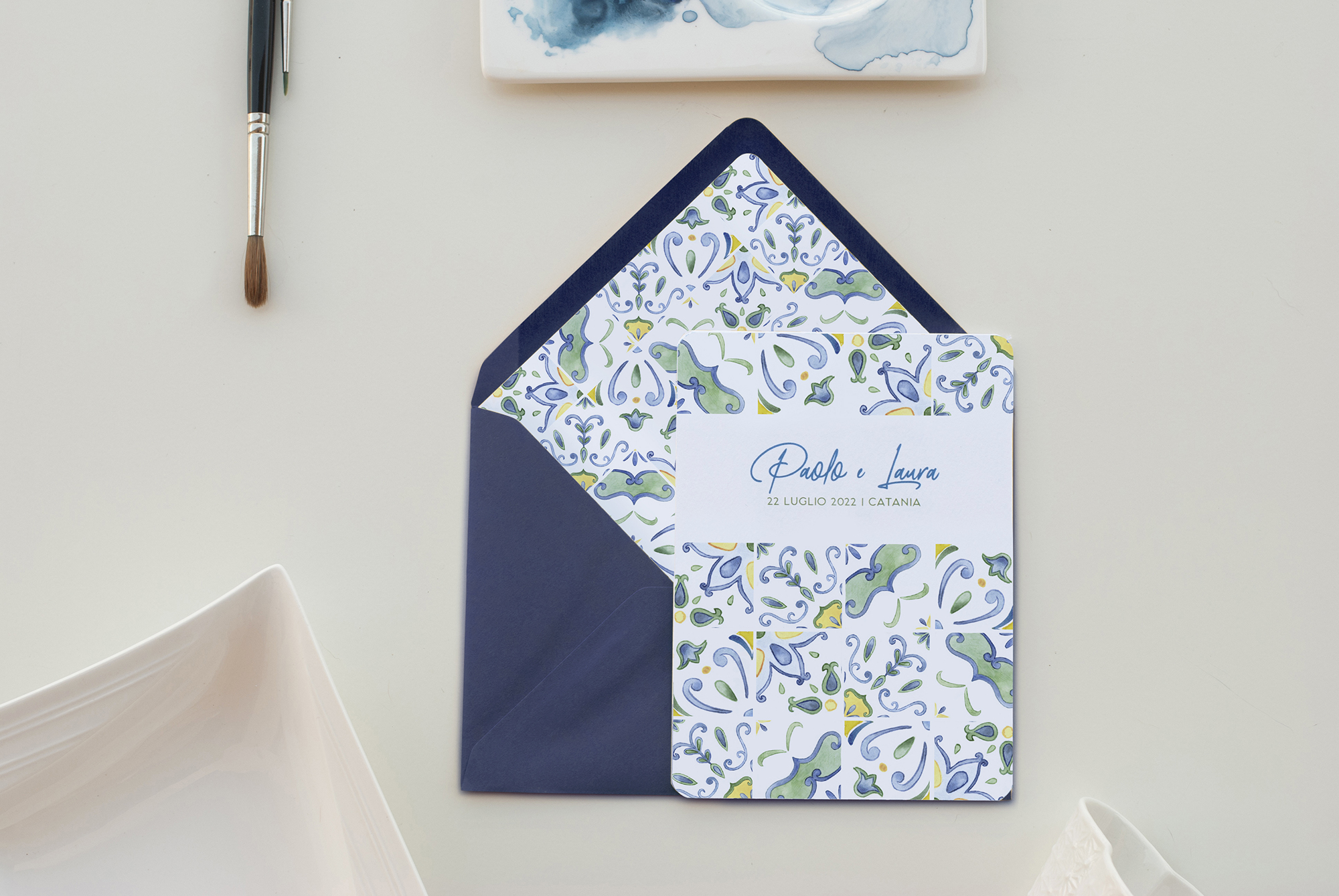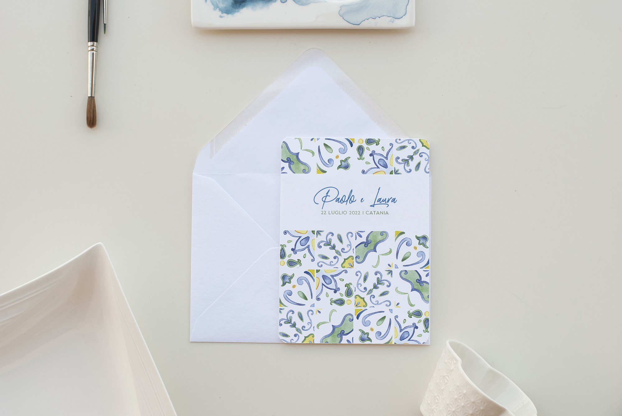 Partecipazione con le stampe di illustrazioni ad acquerello delle ceramiche siciliane; è particolarmente adatta per un matrimonio in Sicilia o per coppie innamorate dell’isola. Ogni pagina della partecipazione è stampata su cartoncino bianco goffrato Favini Prisma. La partecipazione include la copertina, la partecipazione, l’invito al ristorante, le istruzioni per la lista nozze o regalo in denaro e la busta standard, ma è possibile aggiungere: mappa illustrata con le indicazioni per raggiungere la chiesa e il ristorante, calligrafia sulle buste, chiusura in ceralacca.