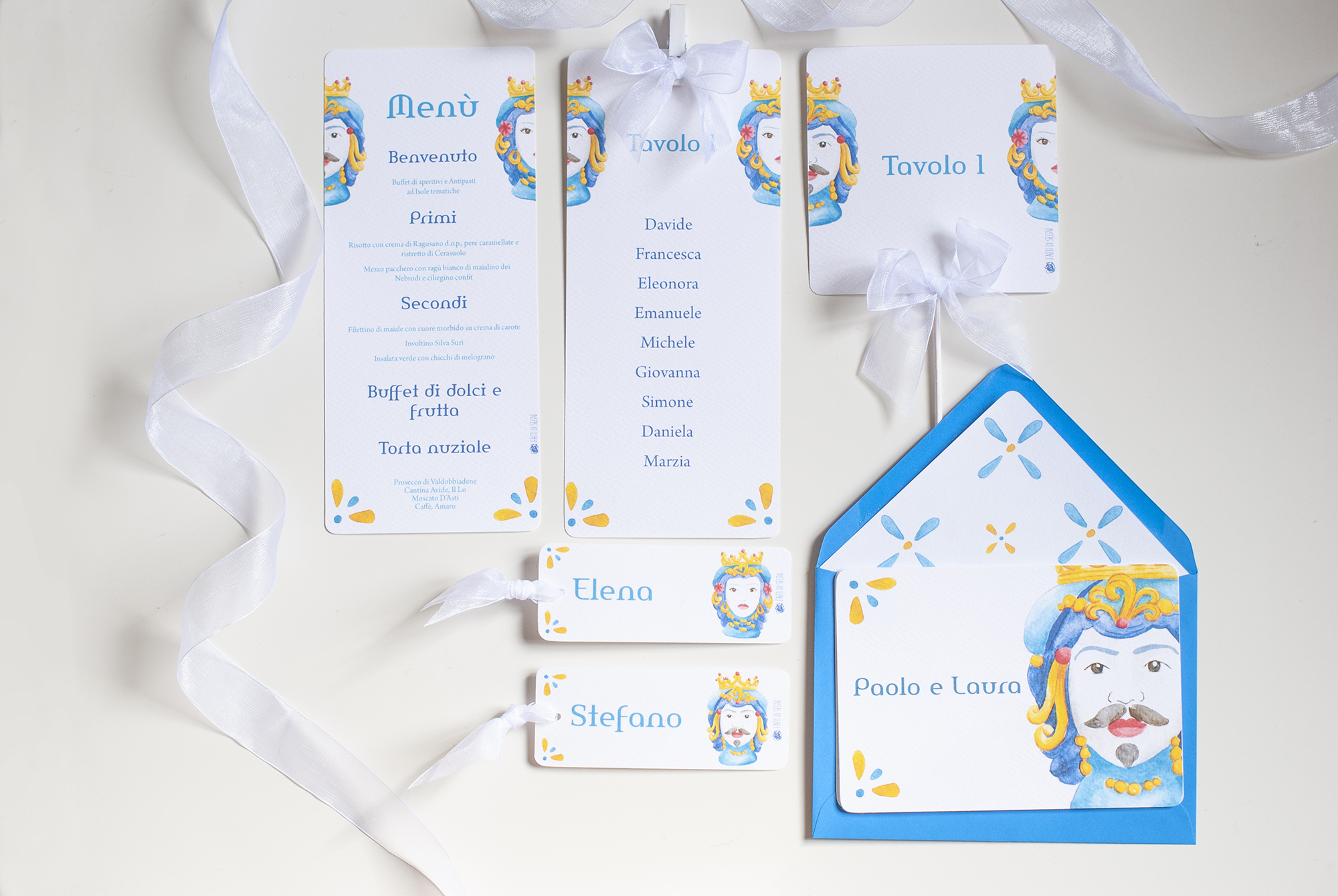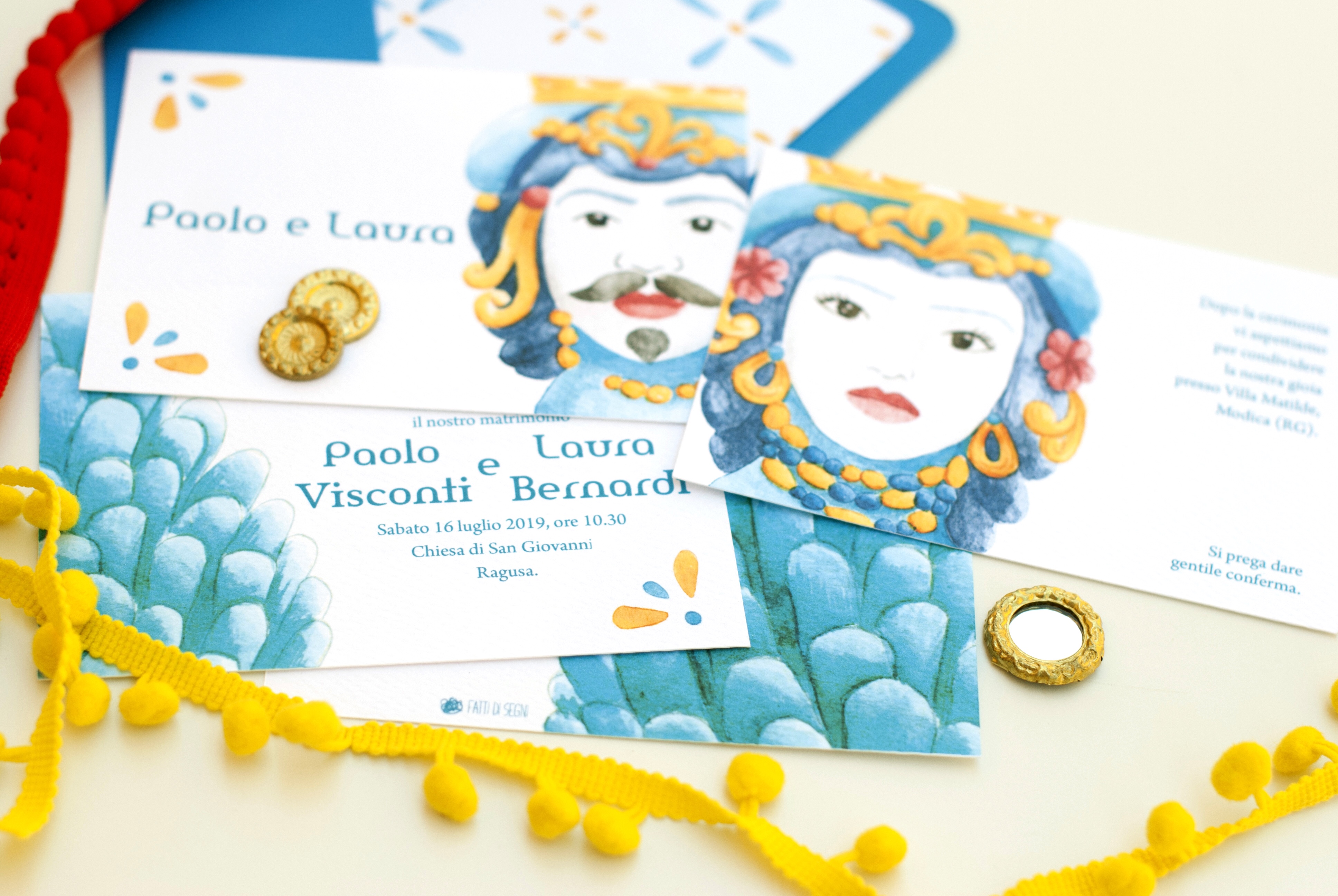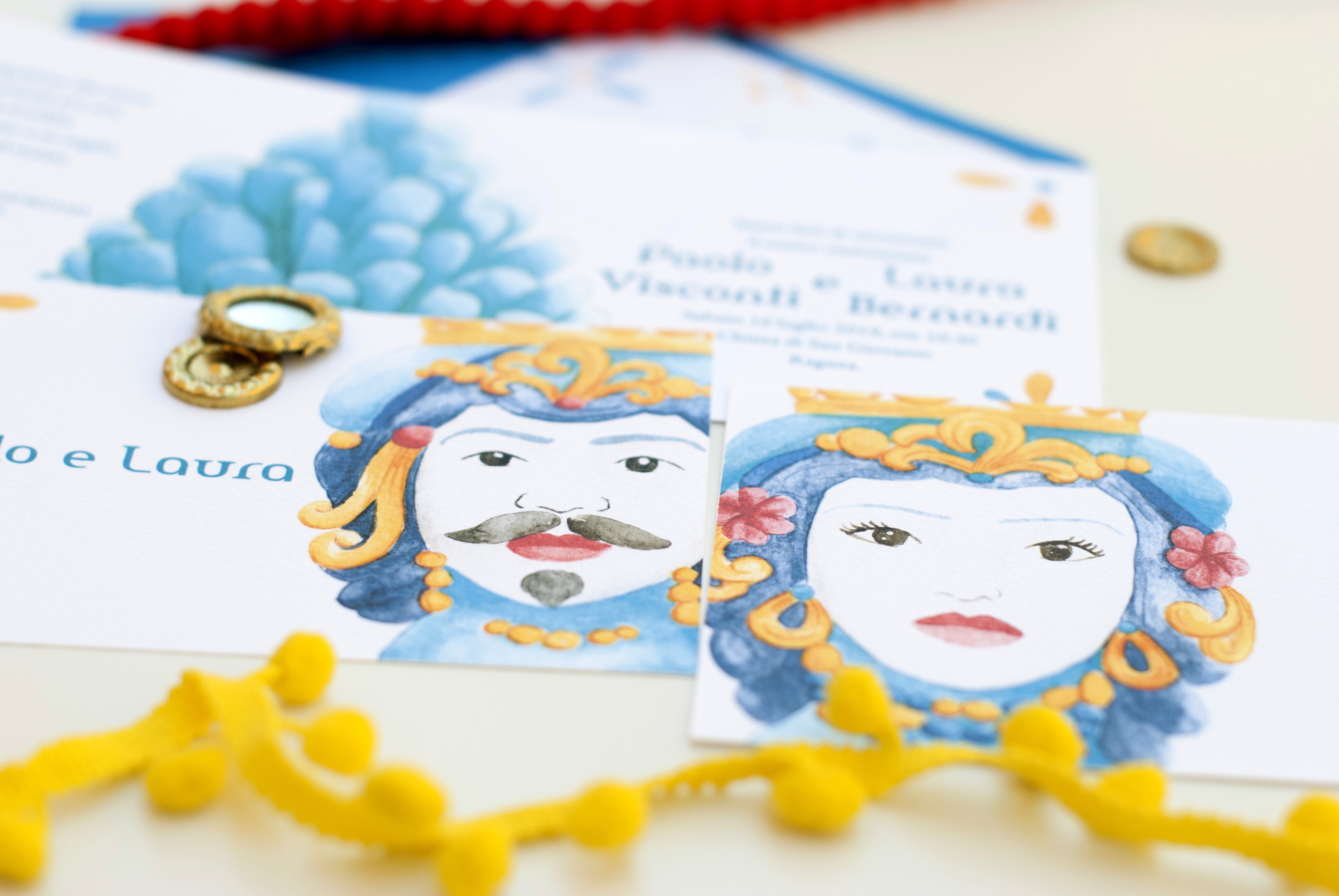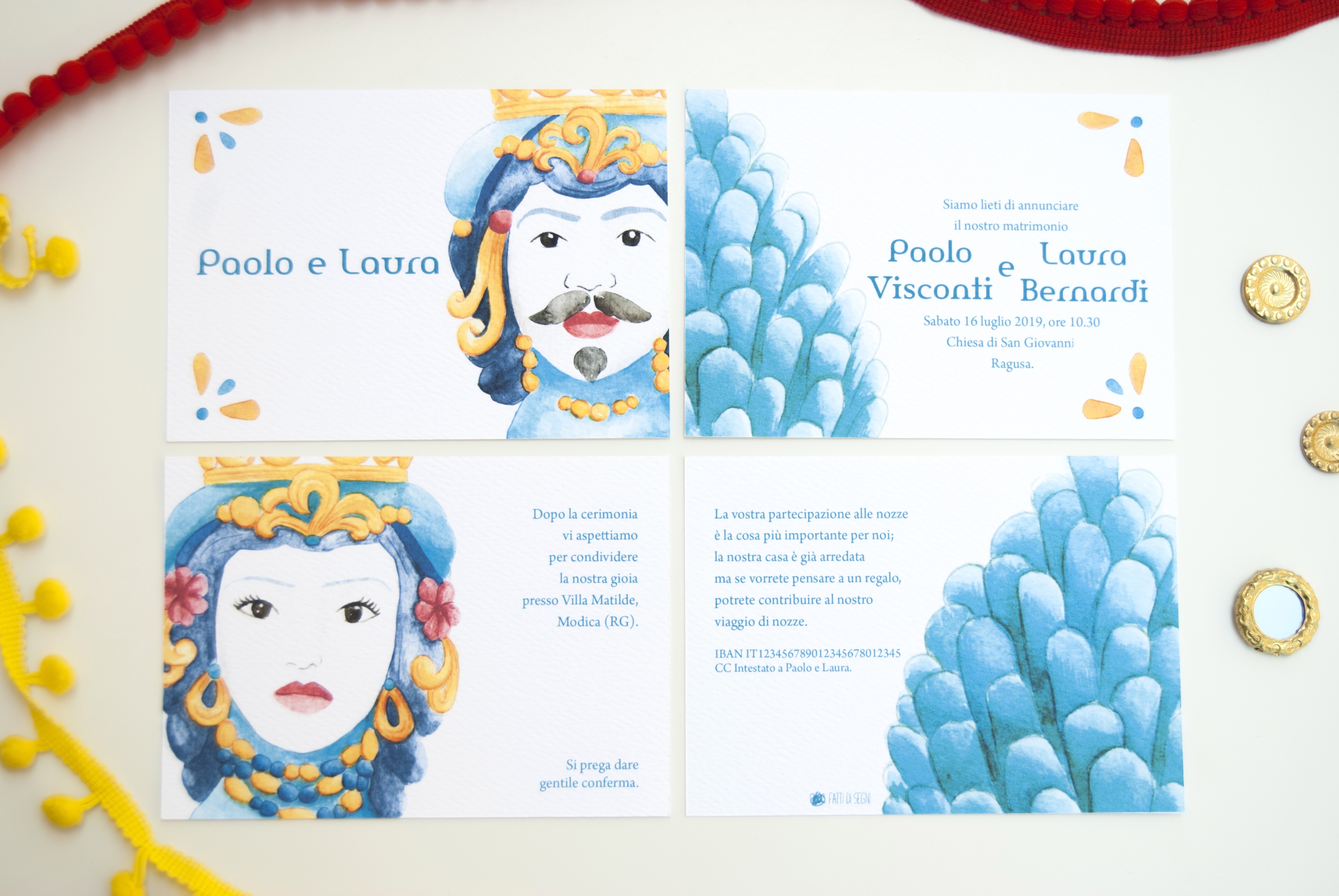 Partecipazione con le stampe di illustrazioni ad acquerello delle ceramiche siciliane di Caltagirone (teste di moro); è particolarmente adatta per un matrimonio in Sicilia o per coppie innamorate dell’isola. Ogni pagina della partecipazione è stampata su cartoncino bianco groffato Favini Prisma . La partecipazione include la copertina, la partecipazione, l’invito al ristorante, le istruzioni per la lista nozze o regalo in denaro e la busta standard, ma è possibile aggiungere: – Mappa illustrata con le indicazioni per raggiungere la chiesa e il ristorante – angoli arrotondati Puoi scegliere un’altra opzione per la busta: la busta rossa rivestita internamente dalla stampa della texture del tema. Dimensioni – busta artigianale: 11,4×16,2 cm – fogli interni: 10×14 cm