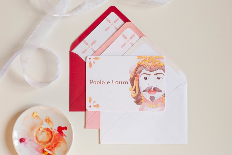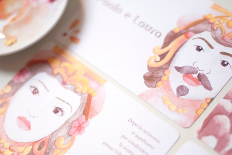 Partecipazione con le stampe di illustrazioni ad acquerello delle ceramiche siciliane di Caltagirone (teste di moro); è particolarmente adatta per un matrimonio in Sicilia o per coppie innamorate dell’isola. Ogni pagina della partecipazione è stampata su cartoncino bianco groffato Favini Prisma . La partecipazione include la copertina, la partecipazione, l’invito al ristorante, le istruzioni per la lista nozze o regalo in denaro e la busta standard, ma è possibile aggiungere: