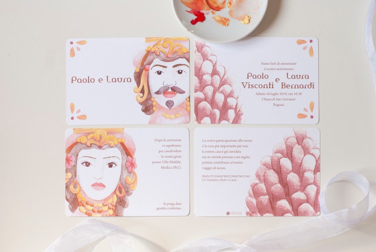 Partecipazione con le stampe di illustrazioni ad acquerello delle ceramiche siciliane di Caltagirone (teste di moro); è particolarmente adatta per un matrimonio in Sicilia o per coppie innamorate dell’isola. Ogni pagina della partecipazione è stampata su cartoncino bianco groffato Favini Prisma . La partecipazione include la copertina, la partecipazione, l’invito al ristorante, le istruzioni per la lista nozze o regalo in denaro e la busta standard, ma è possibile aggiungere: