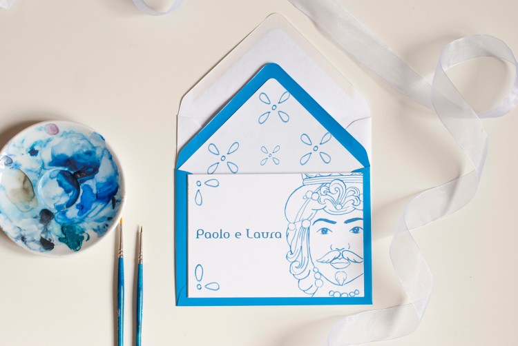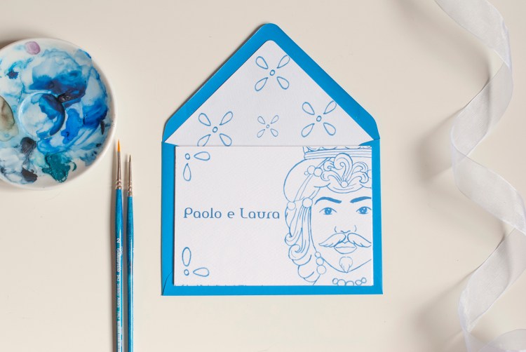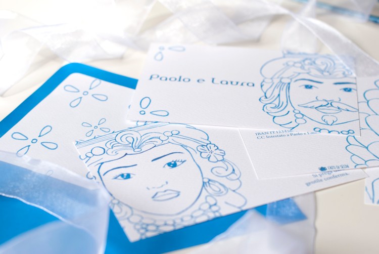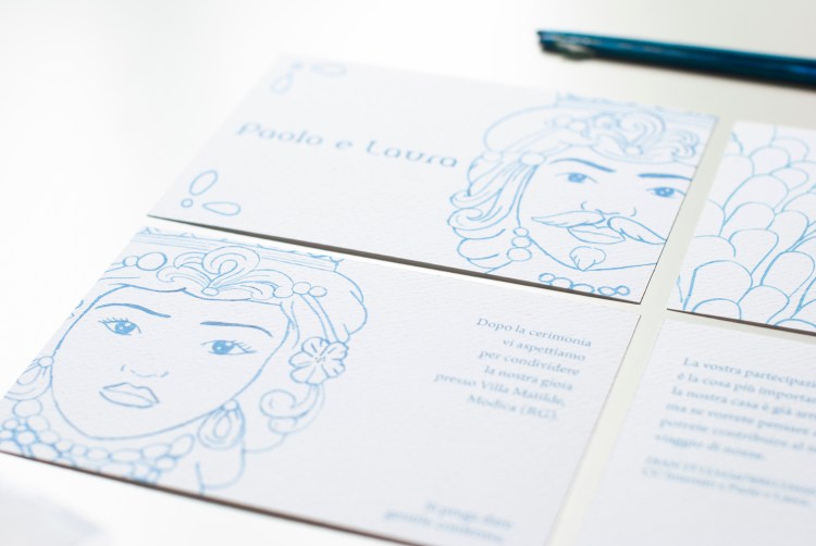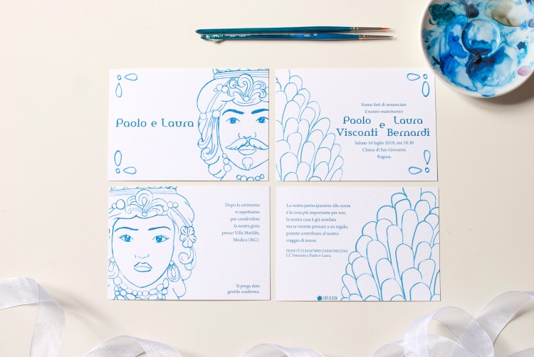 Partecipazione con le stampe di illustrazioni ad acquerello delle ceramiche siciliane di Caltagirone (teste di moro); è particolarmente adatta per un matrimonio in Sicilia o per coppie innamorate dell’isola. Ogni pagina della partecipazione è stampata su cartoncino bianco groffato Favini Prisma . La partecipazione include la copertina, la partecipazione, l’invito al ristorante, le istruzioni per la lista nozze o regalo in denaro e la busta standard, ma è possibile aggiungere: